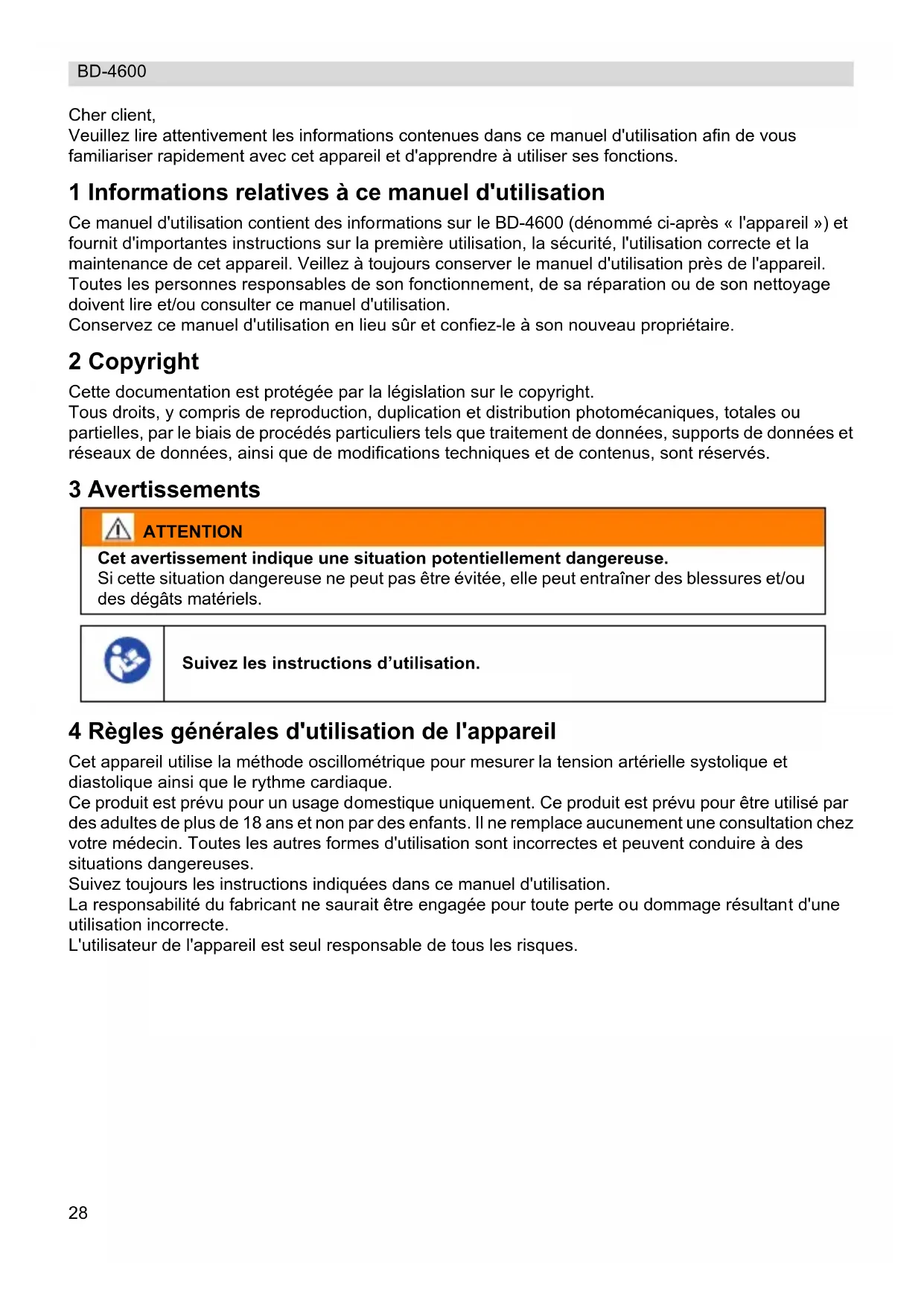 Schade of defecten die te wijten zijn aan onjuist gebruik of bediening en schade die te wijten is aan het gebruik van niet-originele onderdelen of accessoires worden niet gedekt door de garantie. De garantie dekt geen schade die te wijten is aan externe factoren, zoals bliksem, water en brand, noch enige transportschade. Er kan geen aanspraak worden gemaakt op de garantie als het serienummer op het toestel gewijzigd, verwijderd of onleesbaar gemaakt is. Garantieclaims zijn ongeldig wanneer het toestel door de koper werd gerepareerd, gewijzigd of aangepast. Voor constant nauwkeurige metingen wordt aanbevolen om het toestel twee jaar na de aankoopdatum opnieuw te laten kalibreren. De kosten voor verzending, behandeling en herkalibratie zullen in rekening worden gebracht. Voor meer informatie kunt u terecht op www.tristar.eu27 NEDERLANDS BD-460028 BD-4600 Cher client, Veuillez lire attentivement les informations contenues dans ce manuel d'utilisation afin de vous familiariser rapidement avec cet appareil et d'apprendre à utiliser ses fonctions. 1 Informations relatives à ce manuel d'utilisation Ce manuel d'utilisation contient des informations sur le BD-4600 (dénommé ci-après « l'appareil ») et fournit d'importantes instructions sur la première utilisation, la sécurité, l'utilisation correcte et la maintenance de cet appareil. Veillez à toujours conserver le manuel d'utilisation près de l'appareil. Toutes les personnes responsables de son fonctionnement, de sa réparation ou de son nettoyage doivent lire et/ou consulter ce manuel d'utilisation. Conservez ce manuel d'utilisation en lieu sûr et confiez-le à son nouveau propriétaire. 2 Copyright Cette documentation est protégée par la législation sur le copyright. Tous droits, y compris de reproduction, duplication et distribution photomécaniques, totales ou partielles, par le biais de procédés particuliers tels que traitement de données, supports de données et réseaux de données, ainsi que de modifications techniques et de contenus, sont réservés. 3 Avertissements ATTENTION Cet avertissement indique une situation potentiellement dangereuse. Si cette situation dangereuse ne peut pas être évitée, elle peut entraîner des blessures et/ou des dégâts matériels. Suivez les instructions d’utilisation. 4 Règles générales d'utilisation de l'appareil Cet appareil utilise la méthode oscillométrique pour mesurer la tension artérielle systolique et diastolique ainsi que le rythme cardiaque. Ce produit est prévu pour un usage domestique uniquement. Ce produit est prévu pour être utilisé par des adultes de plus de 18 ans et non par des enfants. Il ne remplace aucunement une consultation chez votre médecin. Toutes les autres formes d'utilisation sont incorrectes et peuvent conduire à des situations dangereuses. Suivez toujours les instructions indiquées dans ce manuel d'utilisation. La responsabilité du fabricant ne saurait être engagée pour toute perte ou dommage résultant d'une utilisation incorrecte. L'utilisateur de l'appareil est seul responsable de tous les risques.ATTENTION
