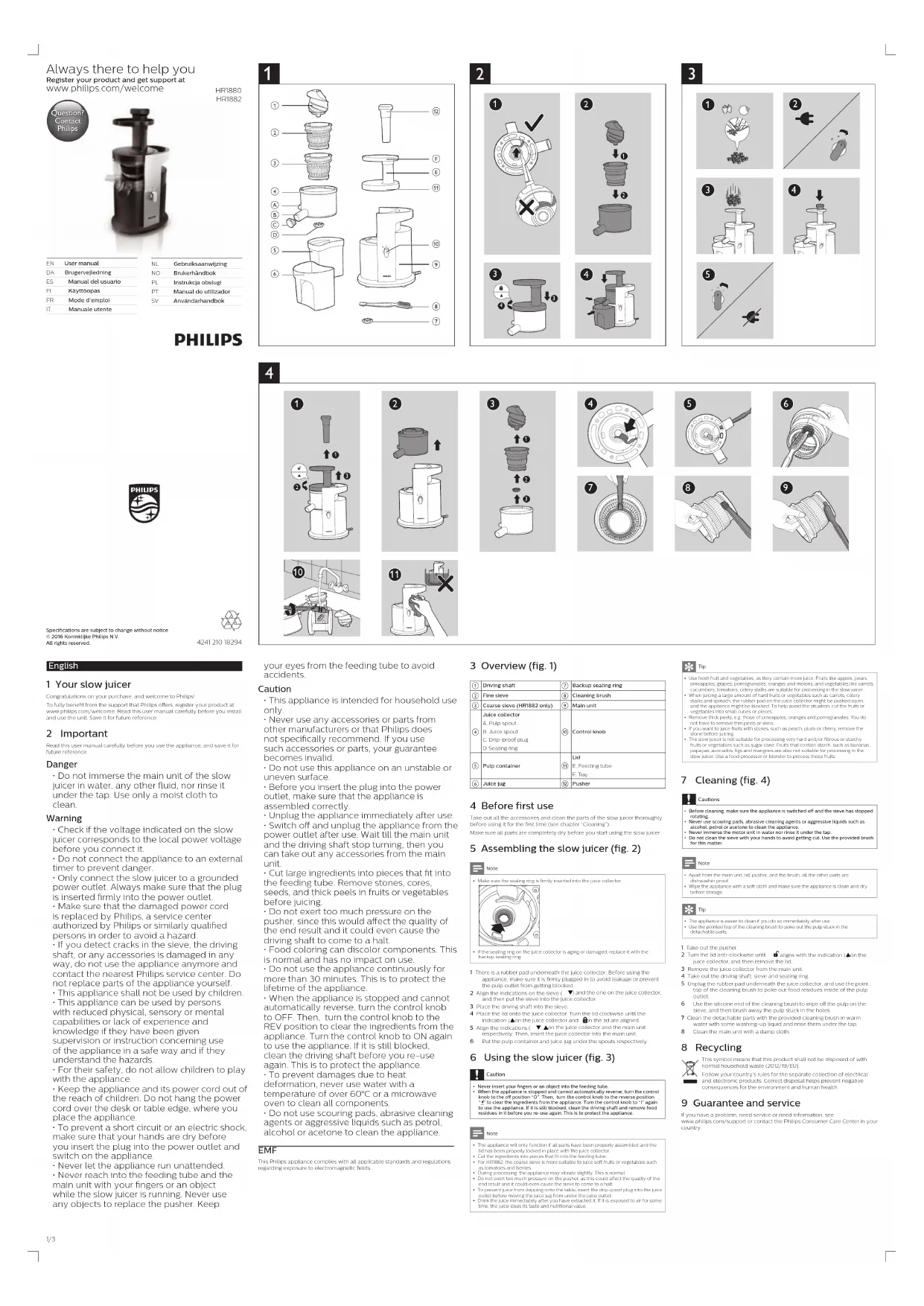 Attention• Ne mettez jamais vos doigts ou tout autre objet dans la cheminée.• Si l'appareil est arrêté et ne peut pas faire marche arrière automatiquement, réglez le bouton de commande sur la position d'arrêt « O ». Ensuite, réglez le bouton de commande sur la position de marche arrière « » pour enlever les ingrédients de l'appareil. Réglez à nouveau le bouton de commande sur « I » pour utiliser l'appareil. S'il est toujours bloqué, nettoyez l'axe d'entraînement et enlevez-en les résidus d'aliments avant de réutiliser l'appareil. Cela permet de protéger l'appareil. Note • Cet appareil fonctionnera uniquement si tous les éléments ont été correctement montés et si le couvercle a été verrouillé correctement avec le récepteur de jus.• Coupez les gros aliments en morceaux an de pouvoir les introduire dans la cheminée de remplissage.• Pour HR1882, le ltre épais convient mieux au pressage de fruits ou légumes tendres tels que les tomates et les baies.• Durant l'utilisation, l'appareil peut vibrer légèrement. Ce phénomène est normal. • N'exercez pas une pression trop forte sur le poussoir car vous risqueriez d'altérer la qualité du résultat, voire de bloquer le ltre.• An d'empêcher tout écoulement de jus sur la table, insérez le bouchon antigoutte dans l'unité d'écoulement du jus avant de déplacer le pichet situé en-dessous de celui-ci. • Buvez le jus immédiatement après l'avoir extrait. S'il reste exposé à l'air un certain temps, le jus perd sa saveur et sa valeur nutritionnelle.Conseil• Utilisez des fruits et des légumes frais, car ils contiennent plus de jus. Les fruits tels que les pommes, poires, ananas, raisins, grenades, oranges et melons, ainsi que les légumes tels que les carottes, concombres, tomates et branches de céleri peuvent être pressés à l'aide de la extracteur de jus lente.• Lorsque vous pressez une grande quantité de fruits ou légumes durs tels que carottes, branches de céleri et épinard, le coussin en caoutchouc situé sur le récepteur de jus peut être ouvert en le poussant et l'appareil peut se bloquer. Pour éviter une telle situation, coupez les fruits ou légumes en petits cubes ou morceaux.• Enlevez les peaux épaisses, par exemple celles des ananas, des oranges et des grenades. Vous n'avez pas besoin d'ôter les peaux ou écorces nes.• Si vous souhaitez presser des fruits contenant des noyaux, comme les pêches, les prunes ou les cerises, retirez les noyaux avant le pressage. • N'utilisez pas la extracteur de jus lente pour la préparation de fruits ou légumes trop durs, breux ou amylacés tels que la canne à sucre. Cette extracteur de jus lente ne convient pas non plus aux fruits qui contiennent de l'amidon, comme les bananes, les papayes, les avocats, les gues et les mangues. Utilisez un robot ménager ou un blender pour ces fruits. 7 Nettoyage (fig. 4)