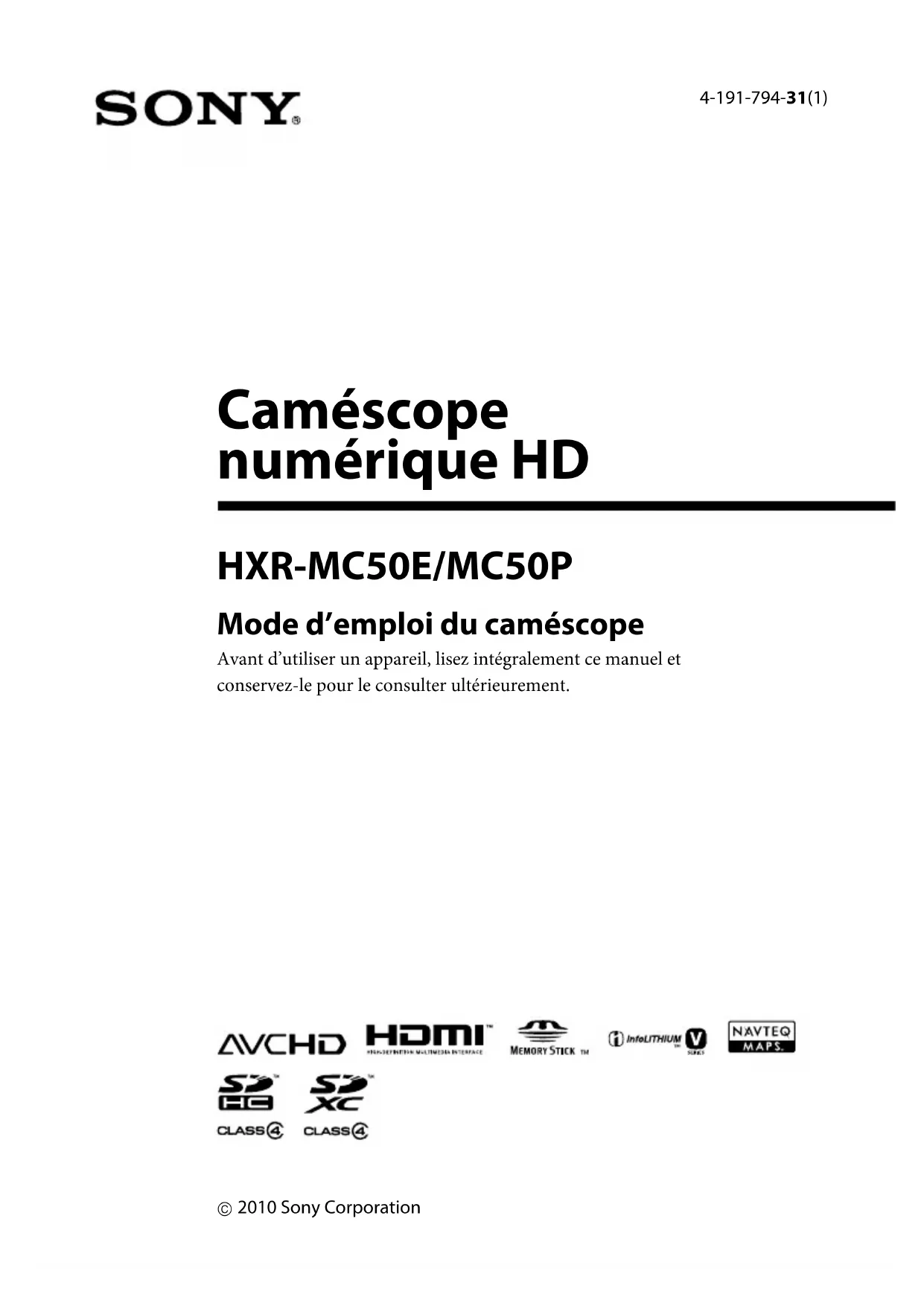 HXRMC50E - Caméscope SONY - Notice d'utilisation et mode d'emploi gratuit