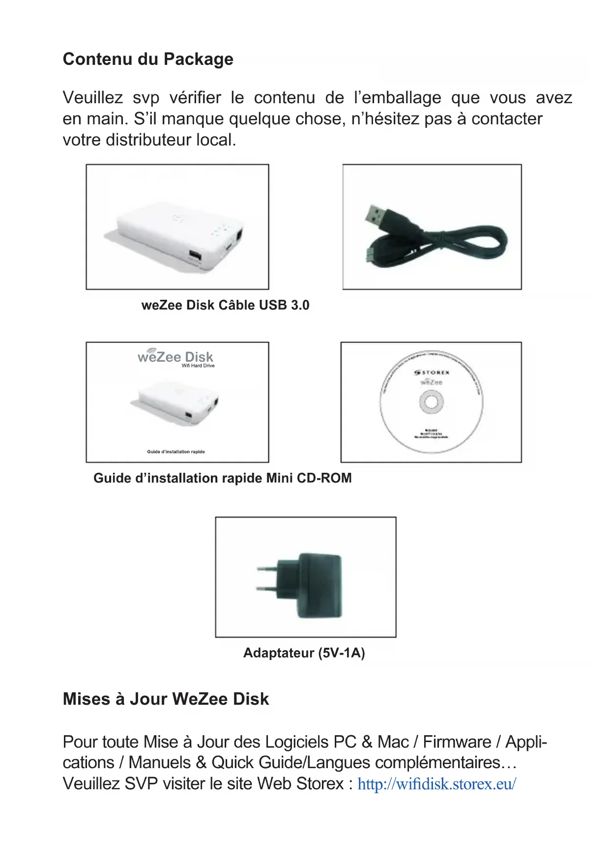 Guide d’installation rapide weZee Disk Wifi Hard DriveContenu du Package Veuillez svp vérier le contenu de l’emballage que vous avez en main. S’il manque quelque chose, n’hésitez pas à contacter votre distributeur local. Mises à Jour WeZee Disk Pour toute Mise à Jour des Logiciels PC & Mac / Firmware / Appli- cations / Manuels & Quick Guide/Langues complémentaires… Veuillez SVP visiter le site Web Storex : http://widisk.storex.eu/ Adaptateur (5V-1A) weZee Disk Câble USB 3.0 Guide d’installation rapide weZee Disk Wifi Hard Drive Guide d’installation rapide Mini CD-ROMPrésentation du weZee Disk LED Niveau de batterie LED Lecture / Ecriture LED WIFI LED WAN