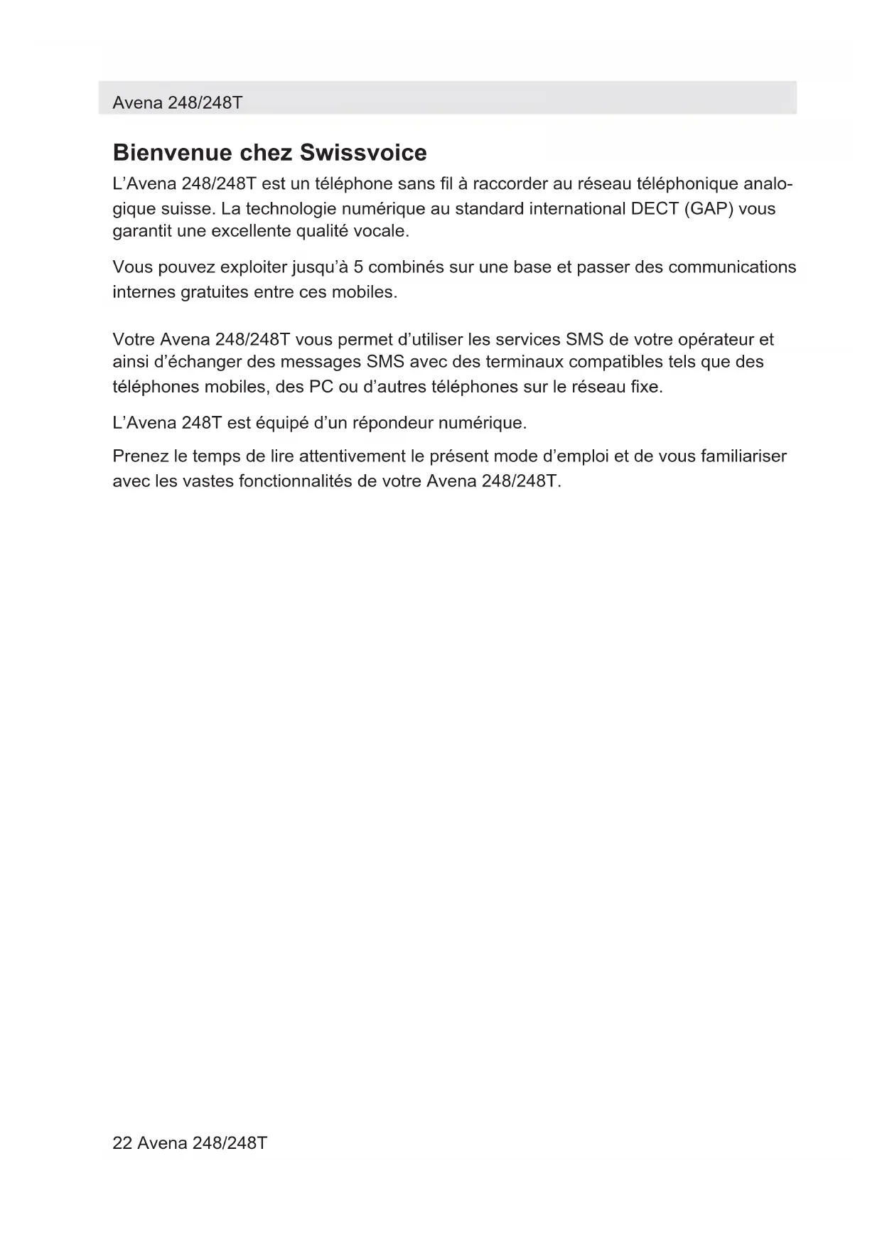- L’adaptateur utilisé pour la conversion de la téléphonie par Internet/câble sur les téléphones analogiques (le plus souvent livré par l'opérateur) n'arrive pas à transfé- rer la fonctionnalité aux téléphones raccordés ou n'est pas en conformité au plan analogique. Si vous êtres confrontés à de tels dysfonctionnements, veuillez si possible tester l’Avena 248/248T sur un raccordement au réseau analogique fixe suisse et/ou contac- tez votre opérateur de téléphonie par Internet/câble à ce sujet. Entretien Votre téléphone est un produit répondant à de hautes exigences en matière de design et de fabrication, raison pour laquelle il convient de le traiter avec soin. Pour nettoyer le téléphone, frottez d’abord l’appareil avec un chiffon antistatique ou une peau de chamois légèrement humide puis séchez-le avec un chiffon sec. Elimination (protection de l’environnement) A la fin de sa durée de vie, l'appareil ne doit pas être éliminé avec les déchets ménagers. Apportez-le à un point de collecte pour le traitement des appareils électriques et électroniques. Le symbole figurant sur le produit, dans le mode d’emploi et/ou l’emballage indique ces conditions d’élimination. Lorsque l'appareil est déposé dans un centre de traitement, certains de ses matériaux peuvent être recyclés. Par la réutilisation de certains éléments ou matériaux bruts des produits usagés, vous contribuez de manière essentielle à la protection de l’environne- ment. Veuillez vous adressez aux autorités locales dont vous dépendez pour tout complé- ment d’information sur les points de collecte près de chez vous. Avena 248/248T Avena 248/248T 41Batteries / élimination des accumulateurs La loi impose la collecte spécifique des piles et accumulateurs usagés. Ils ne peuvent être éliminés avec les ordures ménagères. Pour éliminer les batteries/accumulateurs conformez-vous aux prescriptions en vigueur localement. Amenez-les au recyclage. Les batteries/accumulateurs sont recyclés parce qu’ils peuvent contenir du nickel-cad- mium (Ni-Cd), du plomb (Cd), du cadmium (Cd) ou du mercure (Hg). Les matériaux des batteries / accumulateurs sont signalés par des symboles, Exemple : Garantie Votre appareil bénéficie, à partir de sa date d’acquisition, d’une garantie conforme aux dispositions légales en vigueur dans le pays dans lequel vous l’avez acheté. Pour pouvoir prouver la date d’acquisition de votre appareil, veuillez donc conserver pré- cieusement votre ticket de caisse ou la carte de garantie qui aura été dûment remplie par le responsable de votre point de vente. Pendant la durée de validité de la garantie, tous les défauts de fabrication ou qui auront été constatés sur le matériel seront éliminés gra- tuitement. Cette prestation de garantie prendra la forme soit d’une réparation, soit d’un échange standard de l’appareil défectueux, au choix du fournisseur. Sont exclus de la garantie les consommables (par exemples la batterie), les défauts réduisant de manière insignifiante la valeur ou l’utilisation de l’appareil ainsi que les dommages causés par une utilisation non conforme de l’appareil, l’usure ou l’interven- tion d’un tiers. Les éventuels dommages découlant de l’utilisation, de la défaillance ou d’un défaut du produit et notamment toute responsabilité pour dommages pécuniaires sont expressé- ment exclus de la présente garantie. Pour toute prétention à garantie, veuillez vous adresser au point de vente auprès duquel vous avez acheté votre téléphone. Avena 248/248T 42 Avena 248/248TAvena 248/248T Avena 248/248T 43 Homologation et conformité Ce téléphone analogique DECT est conforme aux exigences fondamentales de la Directive R&TTE 1999/5/CEE concernant les équipements hertziens et les équipe- ments terminaux de télécommunications et est destiné au raccordement et au fonc- tionnement dans le pays dans lequel il a été commercialisé. La déclaration de conformité peut être consultée sur le site suivant: www.swissvoice.net. La conformité du téléphone à la directive mentionnée ci-dessus est attestée par la marque CE sur le téléphone.Benvenuti da Swissvoice L’Avena 248/248T è un telefono cordless concepito per l’allacciamento alla rete analo- gica svizzera. La tecnologia digitale dello standard internazionale DECT (GAP) si con- traddistingue per un’ottima qualità vocale. È possibile collegare fino a 5 portatili ad una stazione base ed effettuare fra questi chiamate interne gratuite. Con il vostro Avena 248/248T potete utilizzare il servizio SMS del vostro gestore di rete per inviare messaggi SMS ad altri terminali abilitati agli SMS, ad es. cellulari, PC o altri telefoni di rete fissa, oppure ricevere messaggi SMS. L’Avena 248T è dotato di una segreteria digitale. Vi preghiamo di leggere attentamente queste istruzioni per l’uso per scoprire ed impa- rare ad utilizzare le numerose funzioni del vostro Avena 248/248T. Avena 248/248T 44 Avena 248/248TIndice Tasti e simboli 46 Portata / Luogo di installazione 47 Avvertenze sull’utilizzo degli accumulatori 47 Simboli indicati sul display del portatile 48 Telefonare 49 Rispondere ad una chiamata 49 Disattivare la suoneria 49 Regolare il volume del ricevitore / del vivavoce 50 Spegnere il portatile 50 Ripetizione della selezione 50 Disattivare il microfono del portatile (Mute) 50 Blocco tastiera 50 Ricerca portatile (paging) - Localizzare un portatile smarrito 50 Rubrica 50 Rubrica condivisa 52 Carta SIM (solo disponibile su apparecchi con segreteria telefonica) 52 Elenco chiamate 53 Servizio SMS (messaggi di testo) 53 Audio 55 Impostazioni 55 Estendere l’Avena 248/248T 57 Parlare con più persone 57 Segreteria telefonica - solo Avena 248T 59 Attivare / Disattivare la segreteria 59 Modificare l’annuncio 59 Coascoltare i messaggi 60 Gestire la segreteria dalla stazione base 60 Gestire la segreteria dal 
