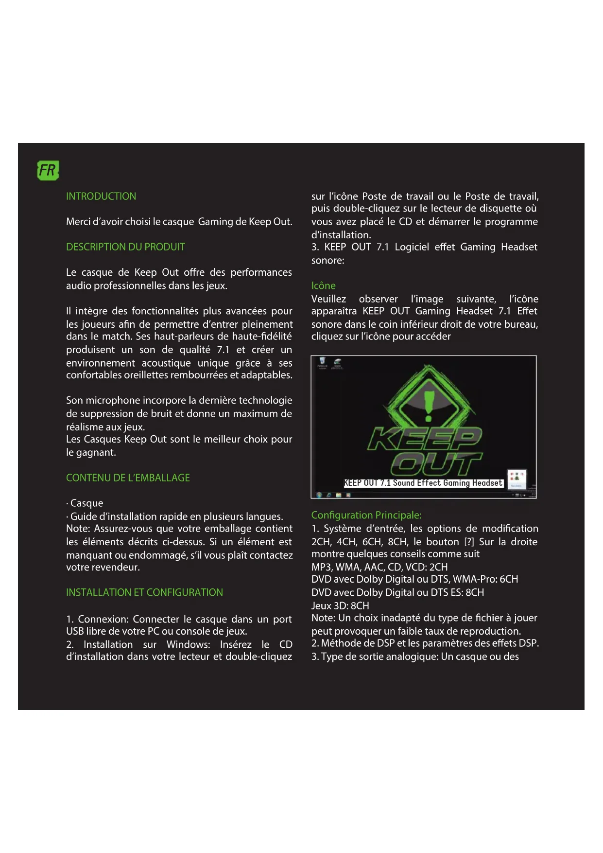sonore: Icône Veuillez observer l’image suivante, l’icône apparaîtra KEEP OUT Gaming Headset 7.1 Eet sonore dans le coin inférieur droit de votre bureau, cliquez sur l’icône pour accéder KEEP OUT 7.1 Sound Effect Gaming Headset Conguration Principale: