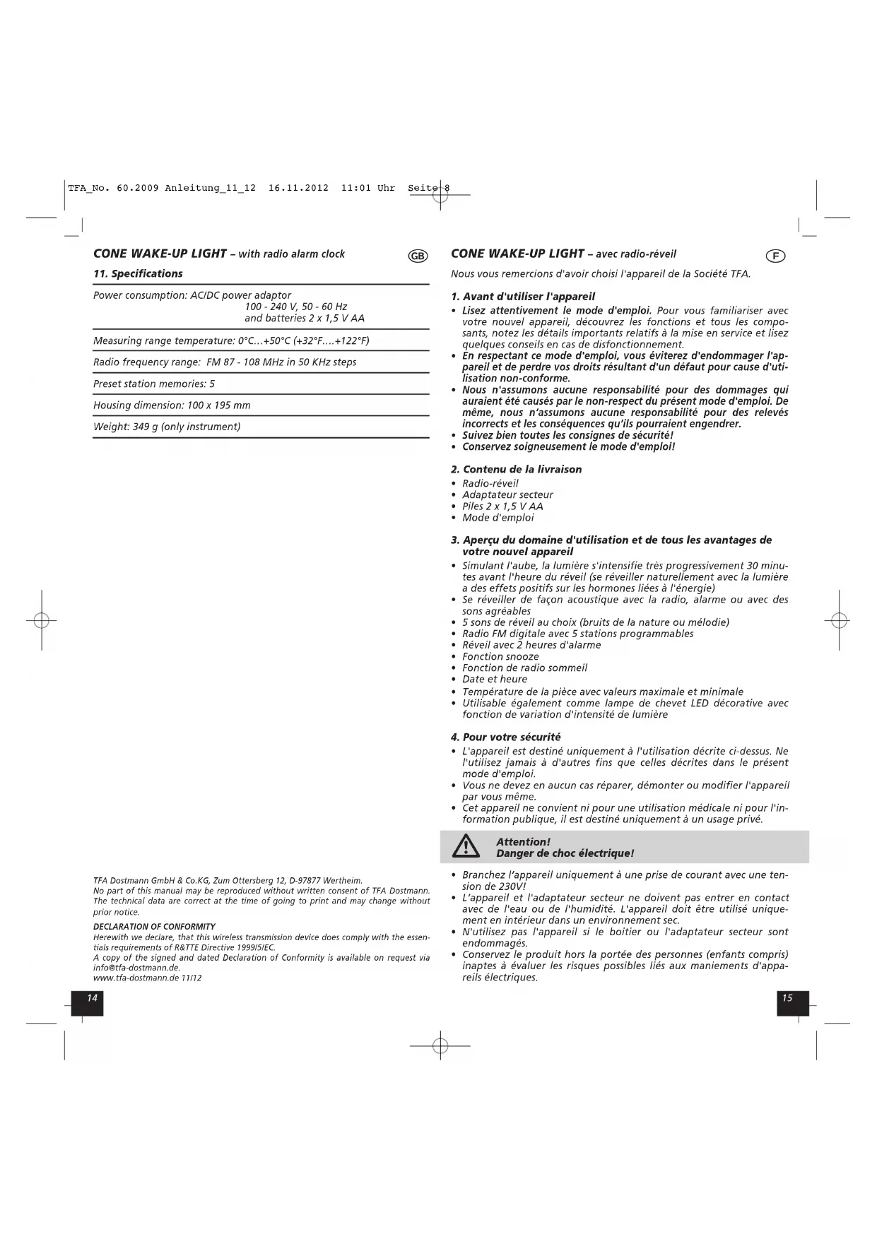 Alimentation Adaptateur secteur 100 - 230 V 50 - 60 Hz et piles 2 x 1,5 V AA Plage mesure température 0°C…+50°C (+32°F…+122°F) Plage de fréquences : FM 87 - 108 MHz par pas de 50 KHz Places de programmes 5 Mesure de boîtier: 100 x 195 mm Poids: 349 g (seule appareil) TFA Dostmann GmbH & Co.KG, Zum Ottersberg 12, D-97877 Wertheim.La reproduction, même partielle de la présente mode d'emploi est strictement interditeavec accord explicite de TFA Dostmann. Les spécifications techniques de ce produit ontété actualisées au moment de l'impression et peuvent être modifiées, sans avis préala-ble. EU-DECLARATION DE CONFORMITENous déclarons ici que cet appareil émetteur récepteur d'ondes radio répond aux exi-gences essentielles de la directive R&TTE 1999/5/CE.Une copie signée et datée de la déclaration de conformité est disponible sur demandeauprès de info@tfa-dostmann.de.www.tfa-dostmann.de 11/12