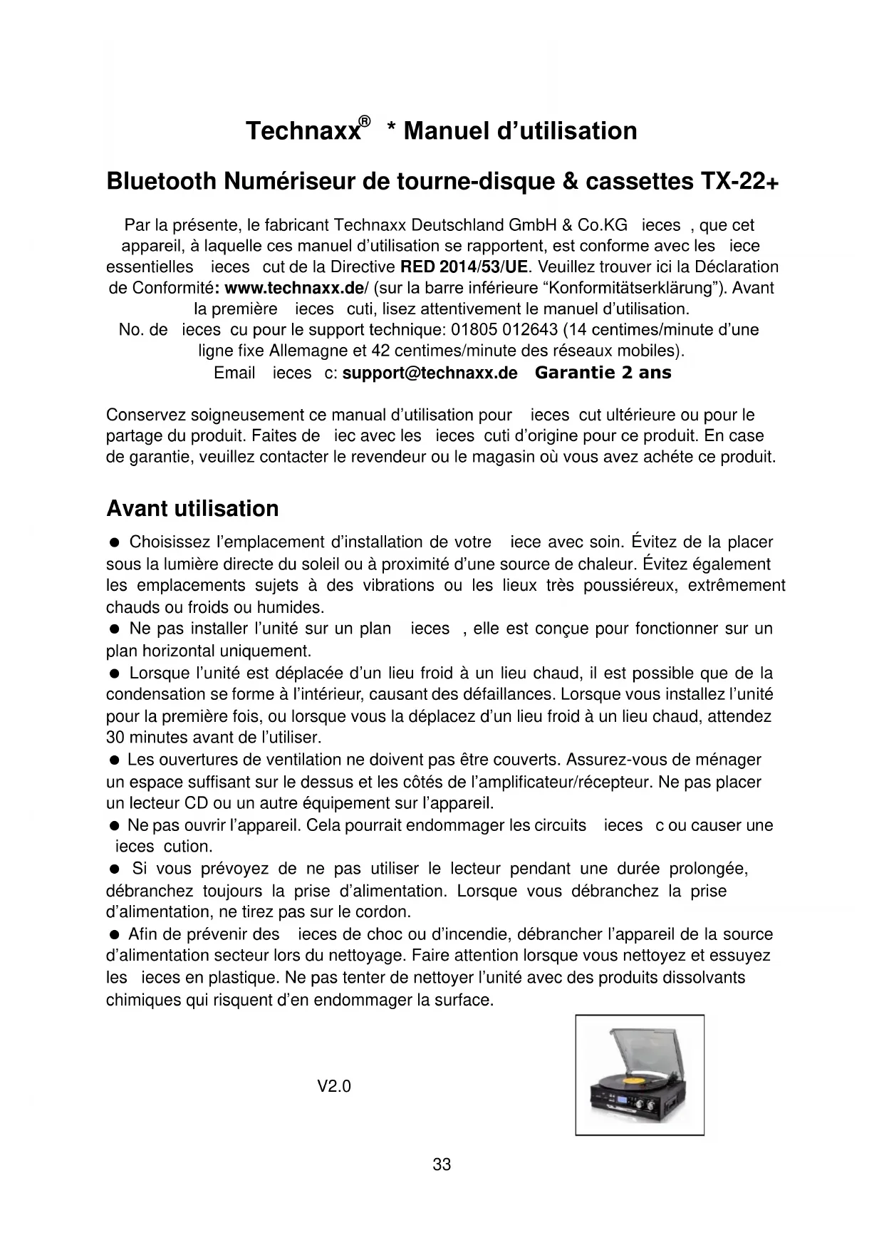 - Manuel d’utilisation Bluetooth Numériseur de tourne-disque & cassettes TX-22+ Par la présente, le fabricant Technaxx Deutschland GmbH & Co.KG ieces , que cet appareil, à laquelle ces manuel d‟utilisation se rapportent, est conforme avec les iece essentielles ieces cut de la Directive RED 2014/53/UE. Veuillez trouver ici la Déclaration de Conformité: www.technaxx.de/ (sur la barre inférieure “Konformitätserklärung”). Avant la première ieces cuti, lisez attentivement le manuel d‟utilisation. No. de ieces cu pour le support technique: 01805 012643 (14 centimes/minute d‟une ligne fixe Allemagne et 42 centimes/minute des réseaux mobiles). Email ieces c: support@technaxx.de Garantie 2 ans Conservez soigneusement ce manual d‟utilisation pour ieces cut ultérieure ou pour le partage du produit. Faites de iec avec les ieces cuti d‟origine pour ce produit. En case de garantie, veuillez contacter le revendeur ou le magasin où vous avez achéte ce produit. Avant utilisation Choisissez l‟emplacement d‟installation de votre iece avec soin. Évitez de la placer sous la lumière directe du soleil ou à proximité d‟une source de chaleur. Évitez également les emplacements sujets à des vibrations ou les lieux très poussiéreux, extrêmement chauds ou froids ou humides. Ne pas installer l‟unité sur un plan ieces , elle est conçue pour fonctionner sur un plan horizontal uniquement. Lorsque l‟unité est déplacée d‟un lieu froid à un lieu chaud, il est possible que de la condensation se forme à l‟intérieur, causant des défaillances. Lorsque vous installez l‟unité pour la première fois, ou lorsque vous la déplacez d‟un lieu froid à un lieu chaud, attendez 30 minutes avant de l‟utiliser. Les ouvertures de ventilation ne doivent pas être couverts. Assurez-vous de ménager un espace suffisant sur le dessus et les côtés de l‟amplificateur/récepteur. Ne pas placer un lecteur CD ou un autre équipement sur l‟appareil. Ne pas ouvrir l‟appareil. Cela pourrait endommager les circuits ieces c ou causer une ieces cution. Si vous prévoyez de ne pas utiliser le lecteur pendant une durée prolongée, débranchez toujours la prise d‟alimentation. Lorsque vous débranchez la prise d‟alimentation, ne tirez pas sur le cordon. Afin de prévenir des ieces de choc ou d‟incendie, débrancher l‟appareil de la source d‟alimentation secteur lors du nettoyage. Faire attention lorsque vous nettoyez et essuyez les ieces en plastique. Ne pas tenter de nettoyer l‟unité avec des produits dissolvants chimiques qui risquent d‟en endommager la surface.