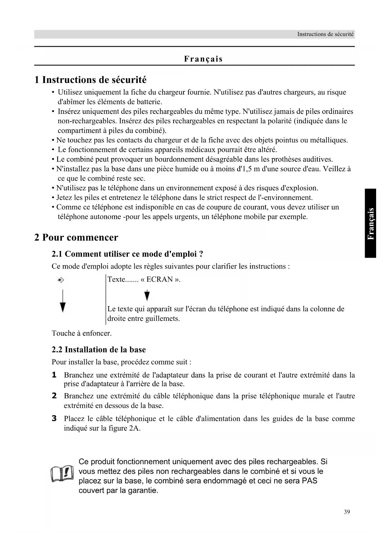 - Insérez uniquement des piles rechargeables du même type. N'utilisez jamais de piles ordinaires non-rechargeables. Insérez des piles rechargeables en respectant la polarité (indiquée dans le compartiment à piles du combiné).