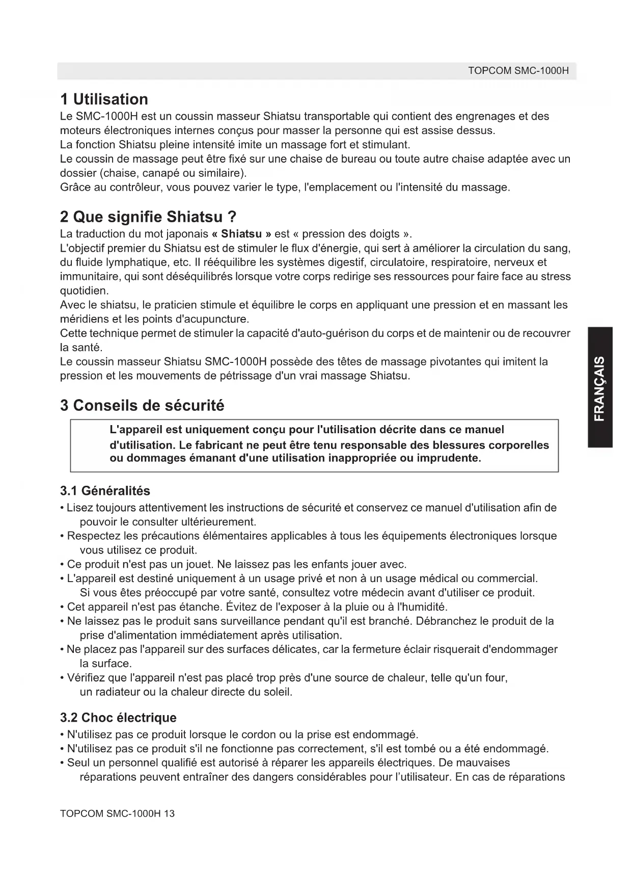FRANÇAIS 1 Utilisation Le SMC-1000H est un coussin masseur Shiatsu transportable qui contient des engrenages et des moteurs électroniques internes conçus pour masser la personne qui est assise dessus. La fonction Shiatsu pleine intensité imite un massage fort et stimulant. Le coussin de massage peut être fixé sur une chaise de bureau ou toute autre chaise adaptée avec un dossier (chaise, canapé ou similaire). Grâce au contrôleur, vous pouvez varier le type, l'emplacement ou l'intensité du massage. 2 Que signifie Shiatsu ? La traduction du mot japonais «Shiatsu» est « pression des doigts ». L'objectif premier du Shiatsu est de stimuler le flux d'énergie, qui sert à améliorer la circulation du sang, du fluide lymphatique, etc. Il rééquilibre les systèmes digestif, circulatoire, respiratoire, nerveux et immunitaire, qui sont déséquilibrés lorsque votre corps redirige ses ressources pour faire face au stress quotidien. Avec le shiatsu, le praticien stimule et équilibre le corps en appliquant une pression et en massant les méridiens et les points d'acupuncture. Cette technique permet de stimuler la capacité d'auto-guérison du corps et de maintenir ou de recouvrer la santé. Le coussin masseur Shiatsu SMC-1000H possède des têtes de massage pivotantes qui imitent la pression et les mouvements de pétrissage d'un vrai massage Shiatsu. 3 Conseils de sécurité