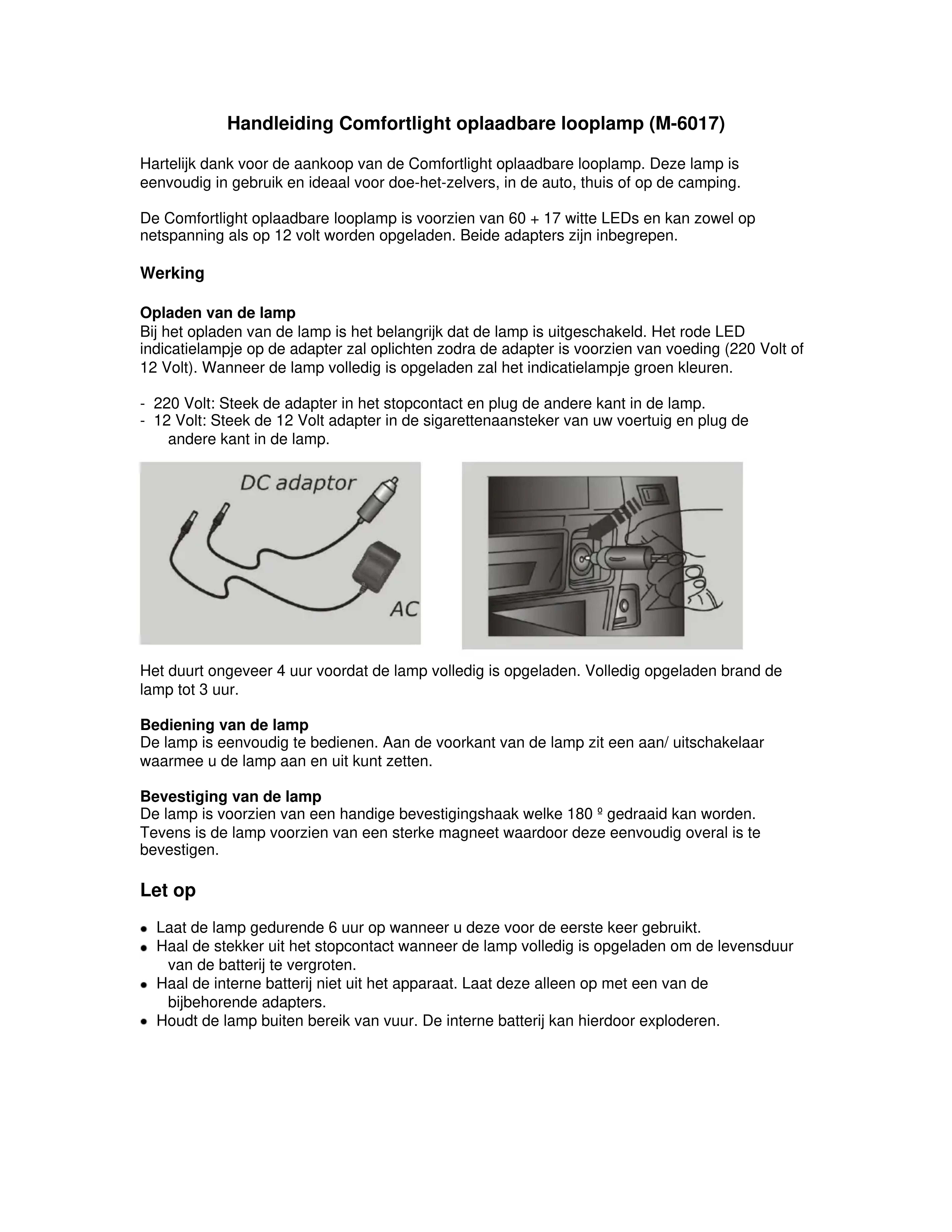 It takes approximately 4 hours before the lamp is fully charged. When fully charged, the lamp will burn for approximately 3 hours. Operating the lamp The lamp is easy to operate. At the front of the lamp is a on/off switch to switch the lamp on or off. Fastening the lamp The lamp has a convenient fastening clasp that can be rotated 180 º. The lamp also have a magnet, making it easy to mount in many places. Important Before using it for the first time, charge the lamp for 6 hours. Remove the plug from the socket when the lamp is fully charged to increase the life of the battery. Do not remove the internal battery from the lamp. The battery can be charged simply by plugging in one of the included adapters. Keep the lamp away from open fire. This might cause the internal battery to explode.Manuel de la lampe loupe rechargeable Comfortlight (M-6017) Félicitations pour l’achat de votre lampe loupe rechargeable Comfortlight. Cette lampe est simple à utiliser et idéale pour les bricoleurs, dans la voiture, à la maison ou en camping. La lampe loupe rechargeable Comfortlight est équipée de 60 + 17 DEL blanches et peut être rechargée sur la tension du réseau ou sur du 12 volts. Les deux adaptateurs sont fournis. Fonctionnement Chargement de la lampe Lorsque vous rechargez la lampe, il est important de veiller à ce qu’elle soit éteinte et que l’interrupteur se trouve dans sa position centrale. Le témoin lumineux DEL rouge s’allumera dès que l’adaptateur reçoit de l’alimentation (220 Volts ou 12 Volts). Lorsque la lampe est entièrement chargée, le témoin lumineux est vert. - 220 Volt : Branchez l’adaptateur dans la prise de courant et l’autre extrémité sur la lampe. - 12 Volts : Branchez l’adaptateur 12 Volts dans l’allume-cigare de votre véhicule et l’autre extrémité sur la lampe.