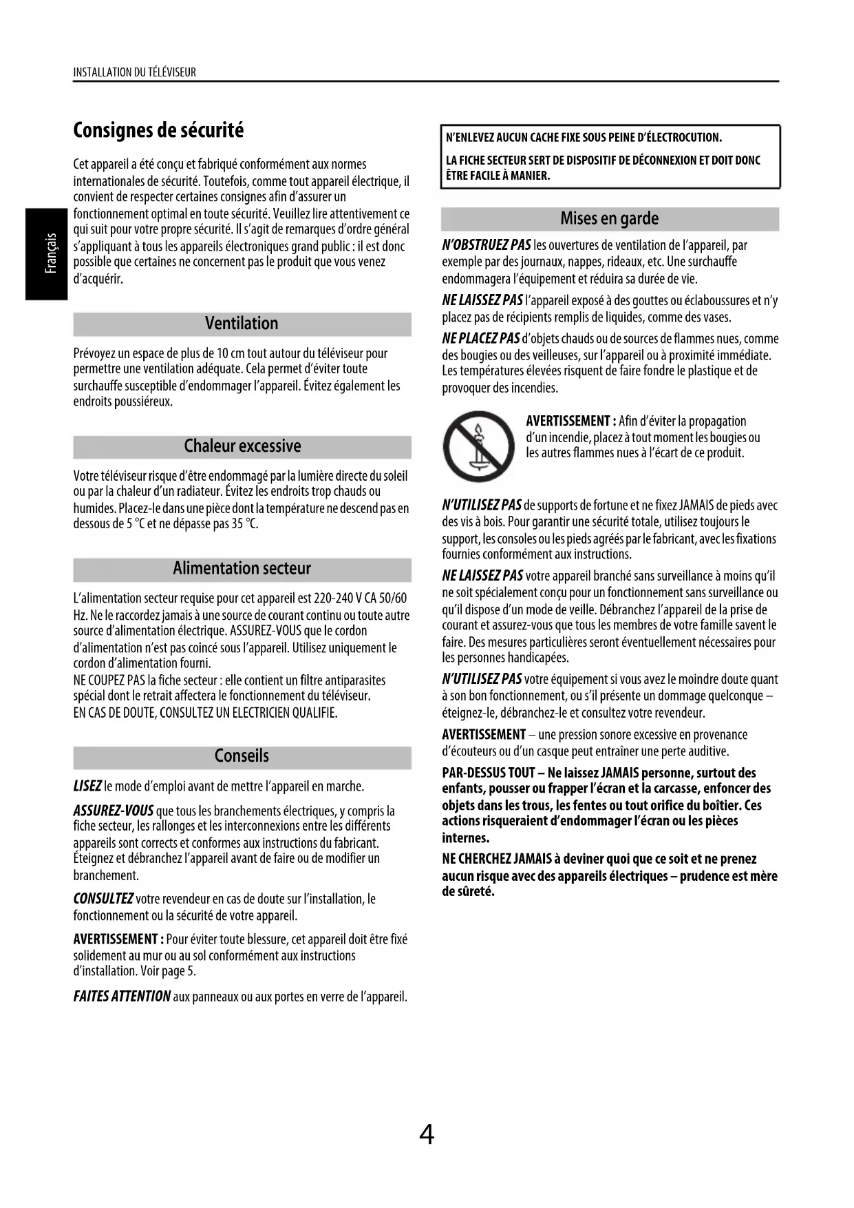 INSTALLATION DU TÉLÉVISEUR Consignes de sécurité 4