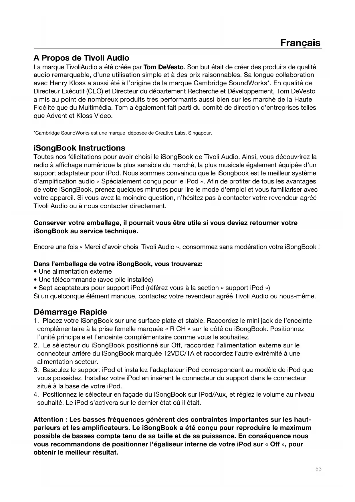 Tipo: Radio AM/FM digital portátil con base para iPod Unidades: 2 altavoces de 63.5mm, rango completo Bandas de recepción: FM:87,5–108MHz AM522-1629kHz(520-1710kHzutilizandopasode10kHz) De-énfasis: 50μsCE/75μsUL Dimensiones: 279.4mmAx157.7mmHx55.6mmP Peso: 1.28 kg Todas las especificaciones están sujetas a cambios sin previo aviso. Tivoli Audio se reserva el derecho de efectuar cambios en los productos sin previo aviso. Tivoli Audio, el logo Tivoli Audio y la iSongBook son marcas registradas de Tivoli Audio, LLC. iPod es una marca registradas de Apple Computer, Inc. Patente pendiente. Para más información acerca de otros excitantes productos Tivoli Audio, por favor visite nuestra página web o contáctenos directamente: Chemison S.L. Tel: +34 93 339 50 54 www.tivoliaudiospain.com53 A Propos de Tivoli Audio La marque TivoliAudio a été créée par Tom DeVesto. Son but était de créer des produits de qualité audio remarquable, d’une utilisation simple et à des prix raisonnables. Sa longue collaboration avec Henry Kloss a aussi été à l’origine de la marque Cambridge SoundWorks*. En qualité de Directeur Exécutif (CEO) et Directeur du département Recherche et Développement, Tom DeVesto a mis au point de nombreux produits très performants aussi bien sur les marché de la Haute Fidélité que du Multimédia. Tom a également fait parti du comité de direction d’entreprises telles que Advent et Kloss Video. *Cambridge SoundWorks est une marque déposée de Creative Labs, Singapour. iSongBook Instructions Toutes nos félicitations pour avoir choisi le iSongBook de Tivoli Audio. Ainsi, vous découvrirez la radio à affichage numérique la plus sensible du marché, la plus musicale également équipée d’un support adaptateur pour iPod. Nous sommes convaincu que le iSongbook est le meilleur système d’amplification audio « Spécialement conçu pour le iPod ». Afin de profiter de tous les avantages de votre iSongBook, prenez quelques minutes pour lire le mode d’emploi et vous familiariser avec votre appareil. Si vous avez la moindre question, n’hésitez pas à contacter votre revendeur agréé Tivoli Audio ou à nous contacter directement. Conserver votre emballage, il pourrait vous être utile si vous deviez retourner votre iSongBook au service technique. Encore une fois « Merci d’avoir choisi Tivoli Audio », consommez sans modération votre iSongBook ! Dans l’emballage de votre iSongBook, vous trouverez: