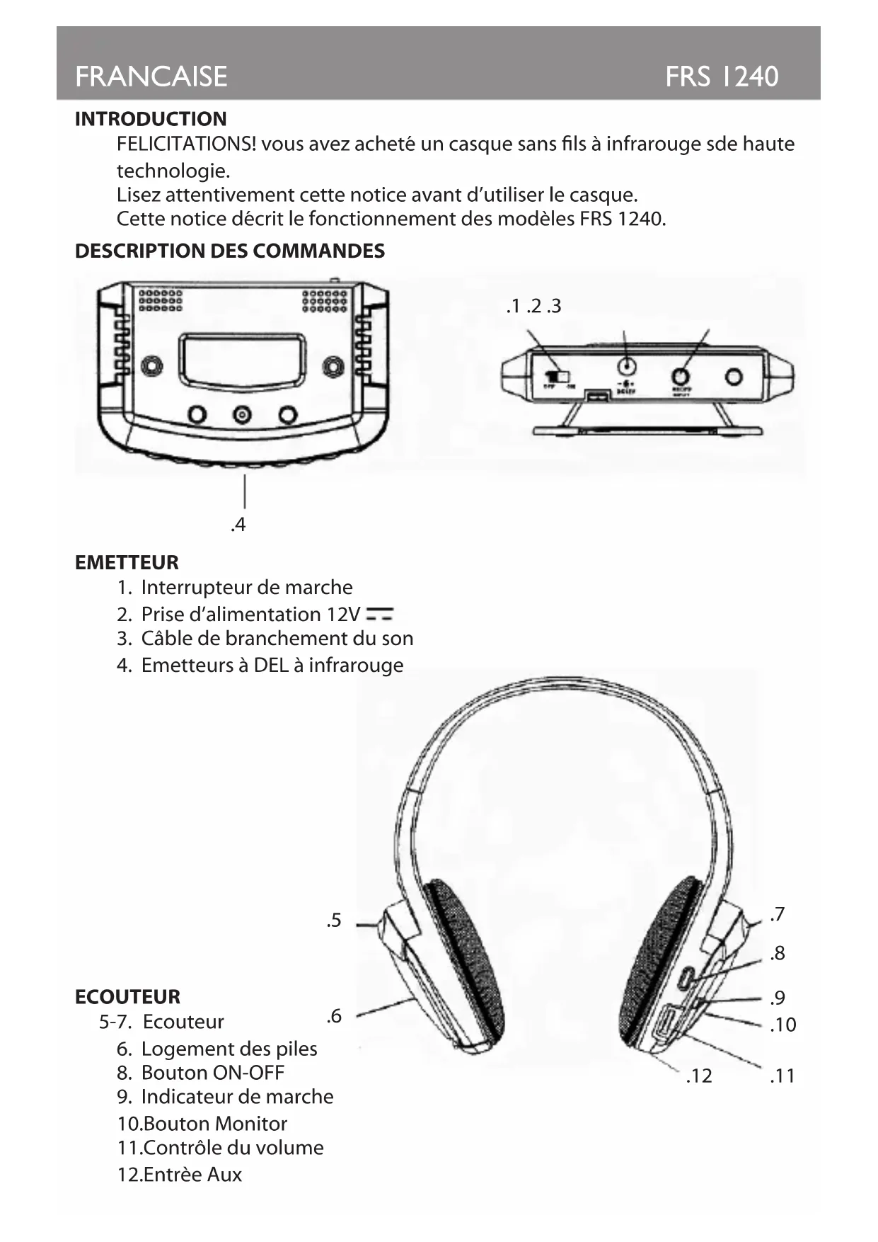 - Conservez ce manuel pour référence ultérieure. Pour prévenir d’éventuelles lésions auditives, limiter la quantité de temps d’écoute à volume élevé. FRANCAISEFRS 1240