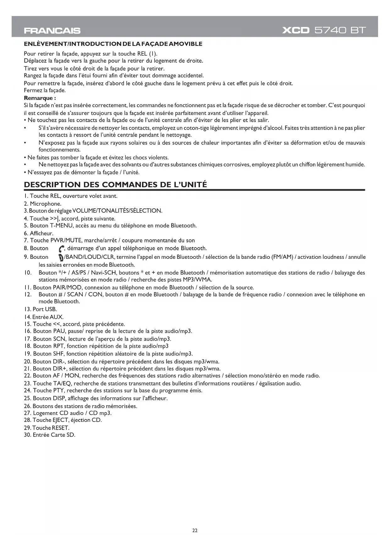 Remarque: il se peut que l'autoradio XCD 5740BT ne supporte pas certains appareils externes avec connexion USB; cela est du à l'incompatibilité des proceseurs.