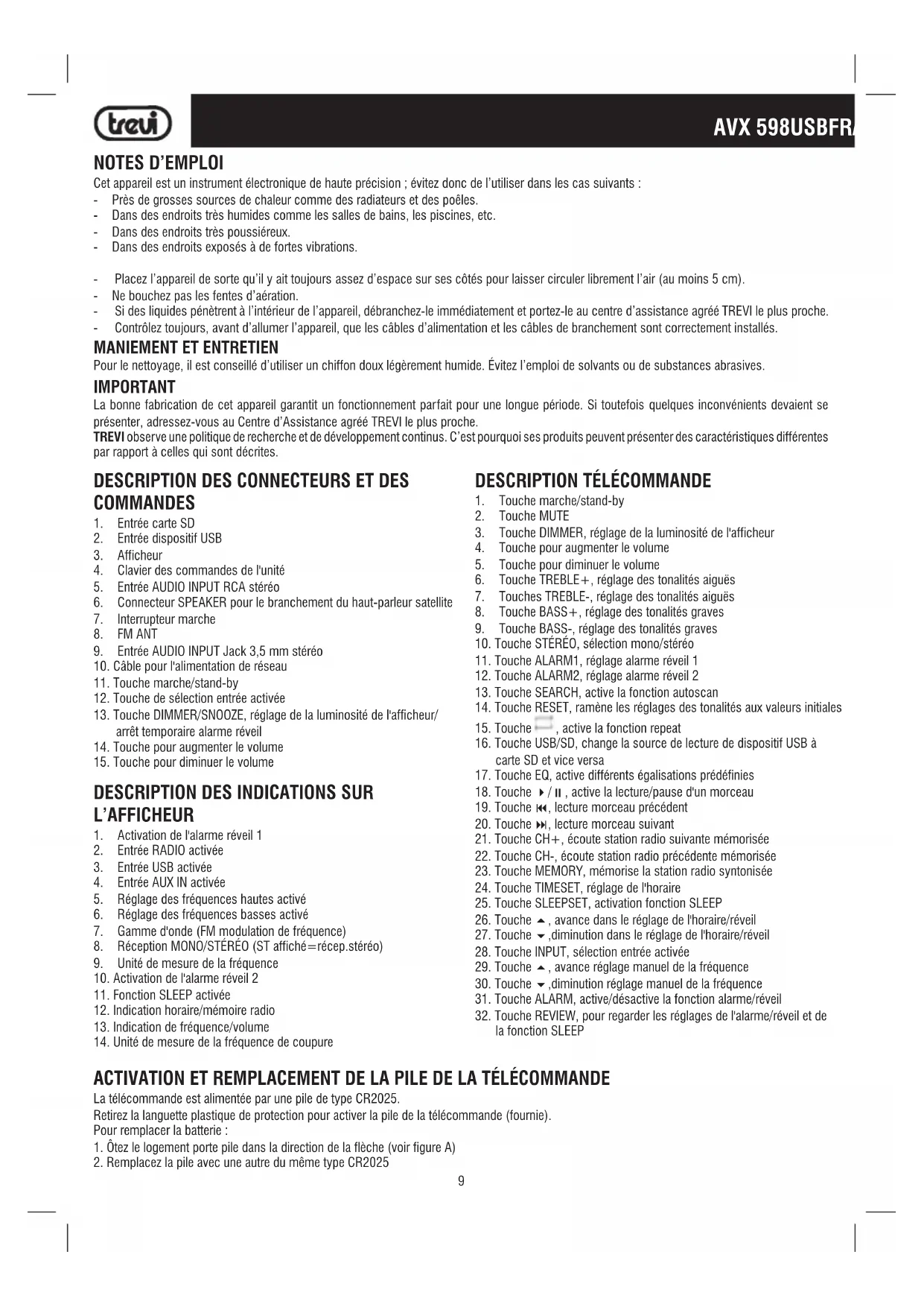 MODE D'EMPLOI AVX 598 USB Trevi
