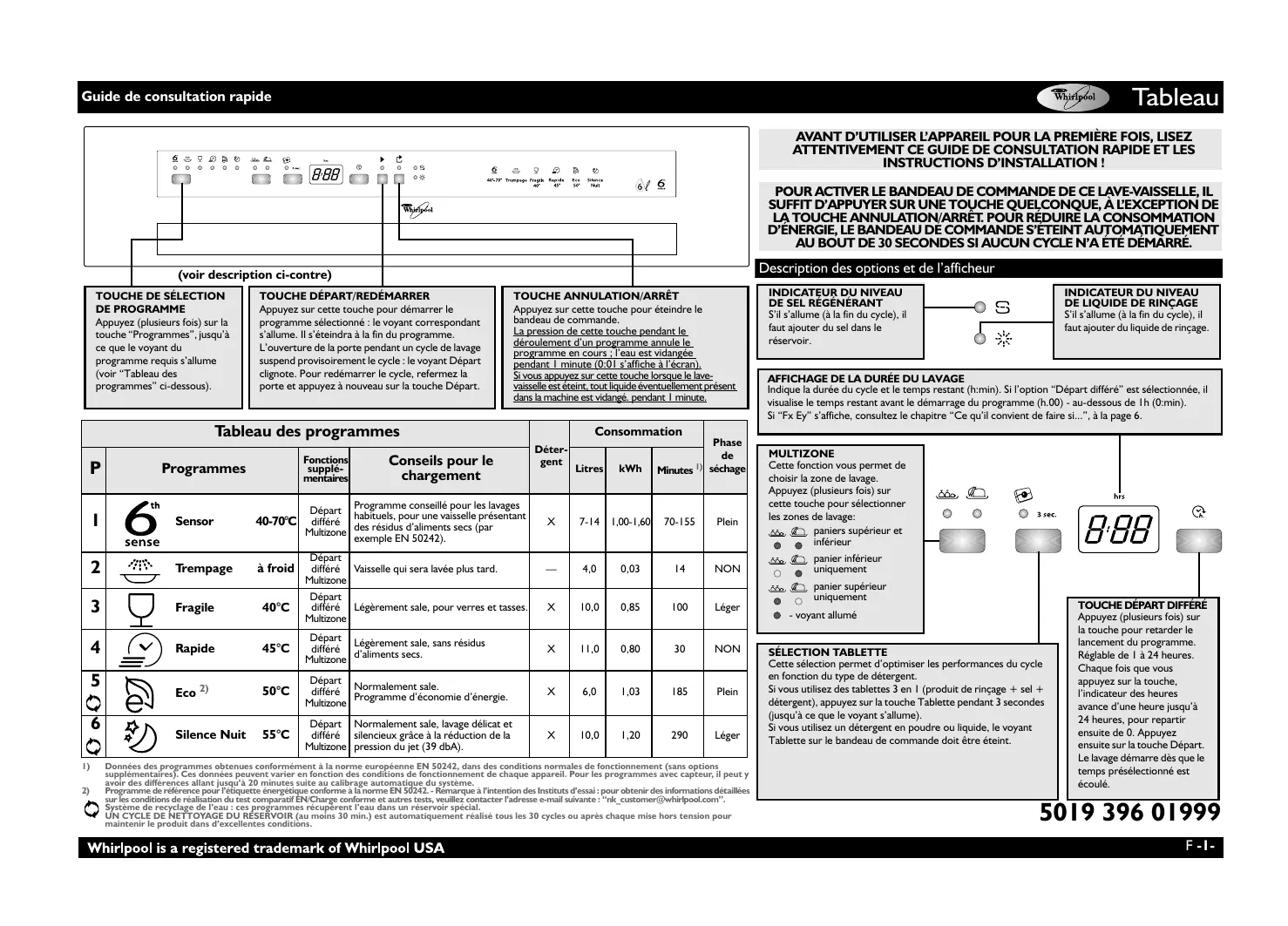 ADG 6240 NB - TABLEAU DE PROGRAMMES - Lave-vaisselle WHIRLPOOL - Notice d'utilisation et mode d'emploi gratuit
