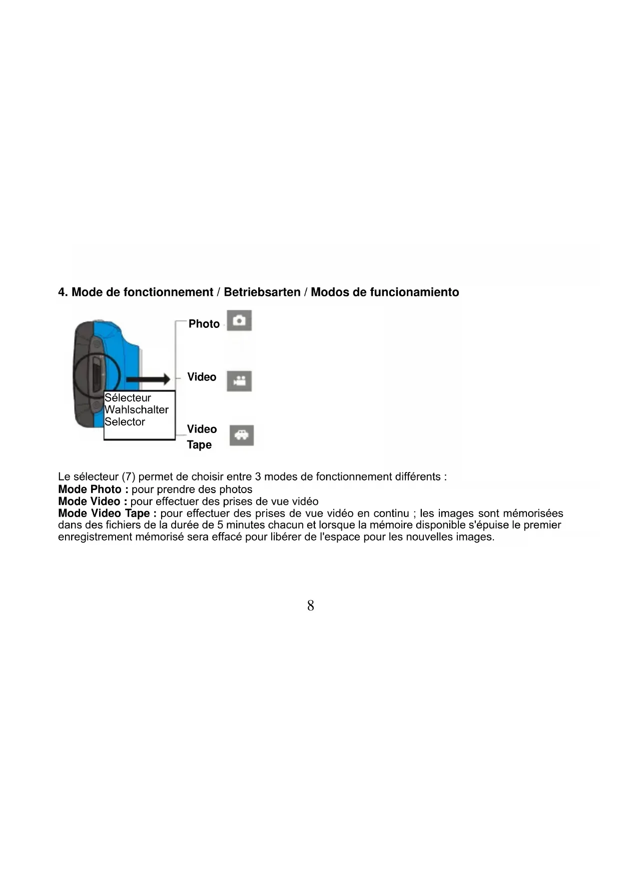 Le sélecteur (7) permet de choisir entre 3 modes de fonctionnement différents : Mode Photo : pour prendre des photos Mode Video : pour effectuer des prises de vue vidéo Mode Video Tape : pour effectuer des prises de vue vidéo en continu ; les images sont mémorisées dans des fichiers de la durée de 5 minutes chacun et lorsque la mémoire disponible s'épuise le premier enregistrement mémorisé sera effacé pour libérer de l'espace pour les nouvelles images.