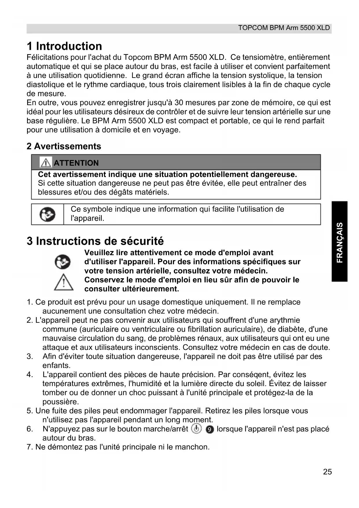 Les dommages et les pannes dus à un mauvais traitement ou à une utilisation incorrecte et les dommages résultant de l'utilisation de pièces et d'accessoires non recommandés par Topcom ne sont pas couverts par la garantie. Les téléphones sans fil Topcom ont été conçus pour fonctionner avec des piles rechargeables uniquement. Les dommages causés par l'utilisation de piles non rechargeables ne sont pas couverts par la garantie. La garantie ne couvre pas les dommages causés par des éléments extérieurs tels que la foudre, l'eau et le feu, ni les dommages provoqués par le transport. Aucune garantie ne pourra être invoquée si le numéro de série indiqué sur les appareils a été modifié, supprimé ou rendu illisible. Aucune garantie ne peut non plus être invoquée si l'appareil a été réparé ou modifié par l'acheteur ou par des techniciens non qualifiés et non agréés par Topcom.36 TOPCOM BPM Arm 5500 XLD 1 Einleitung Wir gratulieren Ihnen zum Kauf des Topcom BPM Arm 5500 XLD. Dieses vollautomatische Blutdruckmessgerät zur Befestigung am Arm ist sowohl einfach zu verwenden als auch ideal geeignet für tägliche Messungen. Das große Display zeigt nach Abschluss jeder Messung deutlich sichtbar systolische und diastolische Werte sowie den Puls an. Darüber hinaus können Sie bis zu 30 Messungen pro Speicherzone speichern. Diese Funktion eignet sich insbesondere für Benutzer, die ihren Blutdruck regelmäßig messen und vergleichen möchten. Das BPM Arm 5500 XLD ist ein kompaktes und tragbares Gerät, das Sie sowohl zu Hause als auch unterwegs benutzen können. 2 Achtung 3 Sicherheitshinweise