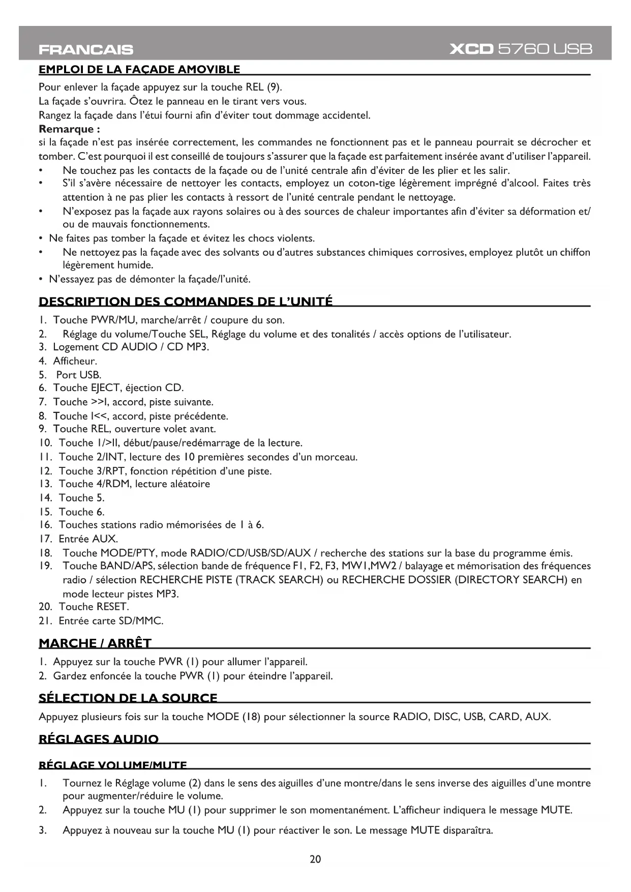 3. Pour les fonctions concernant la gestion de la lecture, consultez le chapitre « FONCTIONNEMENT CD MP3 » REMARQUE : il se peut que l'autoradio XCD 5760USB ne supporte pas certains appareils externes avec connexion USB ; cela est du à l'incompatibilité des proceseurs.