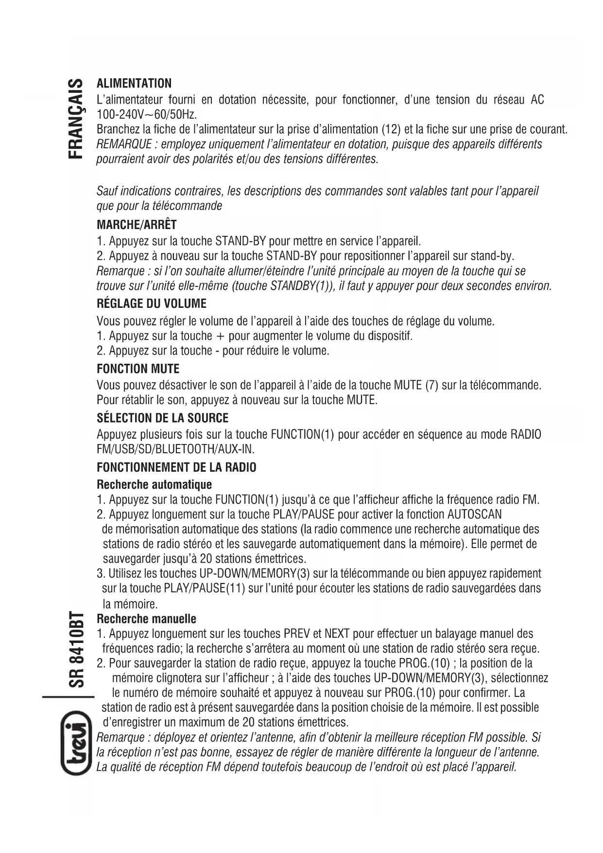 MODE D'EMPLOI SR 8410 BT Trevi