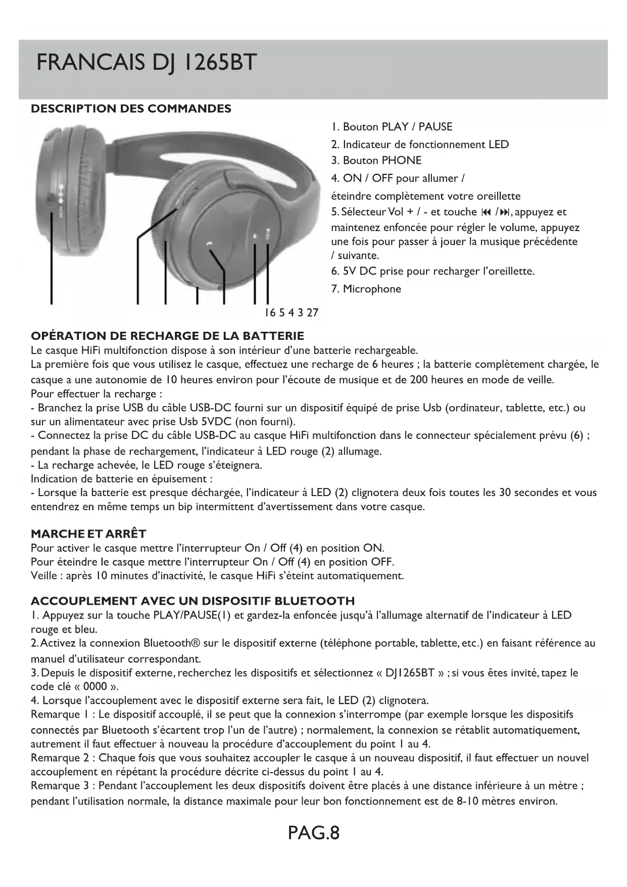 OPÉRATION DE RECHARGE DE LA BATTERIE Le casque HiFi multifonction dispose à son intérieur d’une batterie rechargeable. La première fois que vous utilisez le casque, effectuez une recharge de 6 heures ; la batterie complètement chargée, le casqueauneautonomiede10heuresenvironpourl’écoutedemusiqueetde200heuresenmodedeveille. Pour effectuer la recharge : - Branchez la prise USB du câble USB-DC fourni sur un dispositif équipé de prise Usb (ordinateur, tablette, etc.) ou sur un alimentateur avec prise Usb 5VDC (non fourni). - Connectez la prise DC du câble USB-DC au casque HiFi multifonction dans le connecteur spécialement prévu (6) ; pendant la phase de rechargement, l’indicateur à LED rouge (2) allumage. - La recharge achevée, le LED rouge s’éteignera. Indication de batterie en épuisement : -Lorsquelabatterieestpresquedéchargée,l’indicateuràLED(2)clignoteradeuxfoistoutesles30secondesetvous entendrez en même temps un bip intermittent d’avertissement dans votre casque.