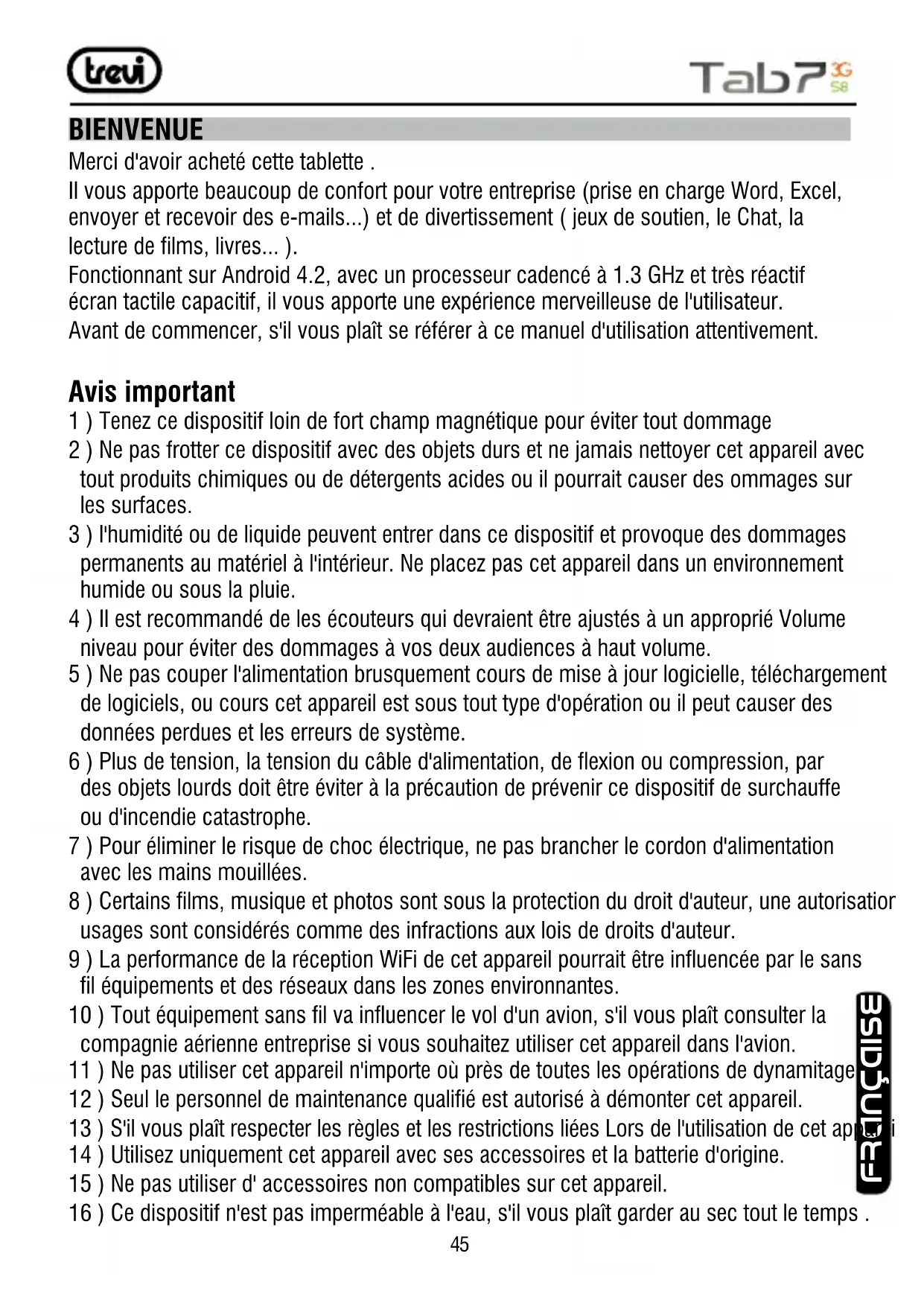 AUDIO FORMAT ......................................................................... MP3, MP2, AAC, FLAC, APE, WAV VIDEO FORMAT ....................................................AVI, 3GP, MP4, MPEG, FLV, MKV, VOB, MP4, MPG PICTURE FORMAT ................................................................................................. JPEG, BMP, PNG ENGLISH45 FRANÇAISE BIENVENUE Merci d'avoir acheté cette tablette . Il vous apporte beaucoup de confort pour votre entreprise (prise en charge Word, Excel, envoyer et recevoir des e-mails...) et de divertissement ( jeux de soutien, le Chat, la lecture de lms, livres... ). Fonctionnant sur Android 4.2, avec un processeur cadencé à 1.3 GHz et très réactif écran tactile capacitif, il vous apporte une expérience merveilleuse de l'utilisateur. Avant de commencer, s'il vous plaît se référer à ce manuel d'utilisation attentivement. Avis important 1 ) Tenez ce dispositif loin de fort champ magnétique pour éviter tout dommage 2 ) Ne pas frotter ce dispositif avec des objets durs et ne jamais nettoyer cet appareil avec tout produits chimiques ou de détergents acides ou il pourrait causer des ommages sur les surfaces. 3 ) l'humidité ou de liquide peuvent entrer dans ce dispositif et provoque des dommages permanents au matériel à l'intérieur. Ne placez pas cet appareil dans un environnement humide ou sous la pluie. 4 ) Il est recommandé de les écouteurs qui devraient être ajustés à un approprié Volume niveau pour éviter des dommages à vos deux audiences à haut volume. 5 ) Ne pas couper l'alimentation brusquement cours de mise à jour logicielle, téléchargement de logiciels, ou cours cet appareil est sous tout type d'opération ou il peut causer des données perdues et les erreurs de système. 6 ) Plus de tension, la tension du câble d'alimentation, de exion ou compression, par des objets lourds doit être éviter à la précaution de prévenir ce dispositif de surchauffe ou d'incendie catastrophe. 7 ) Pour éliminer le risque de choc électrique, ne pas brancher le cordon d'alimentation avec les mains mouillées. 8 ) Certains lms, musique et photos sont sous la protection du droit d'auteur, une autorisation usages sont considérés comme des infractions aux lois de droits d'auteur. 9 ) La performance de la réception WiFi de cet appareil pourrait être inuencée par le sans l équipements et des réseaux dans les zones environnantes. 10 ) Tout équipement sans l va inuencer le vol d'un avion, s'il vous plaît consulter la compagnie aérienne entreprise si vous souhaitez utiliser cet appareil dans l'avion. 11 ) Ne pas utiliser cet appareil n'importe où près de toutes les opérations de dynamitage. 12 ) Seul le personnel de maintenance qualié est autorisé à démonter cet appareil. 13 ) S'il vous plaît respecter les règles et les restrictions liées Lors de l'utilisation de cet appareil. 14 ) Utilisez uniquement cet appareil avec ses accessoires et la batterie d'origine. 15 ) Ne pas utiliser d' accessoires non compatibles sur cet appareil. 16 ) Ce dispositif n'est pas imperméable à l'eau, s'il vous plaît garder au sec tout le temps .46 17 ) Pour des raisons de sécurité des données, s'il vous plaît sauvegarder les données importantes à tout moment en temps opportun. 18 ) Lors de la connexion de cet appareil avec d'autres équipements, s'il vous plaît suivez les instructions le manuel de l'utilisateur. 19 ) Ne jamais connecter cet appareil avec tout équipement incompatible. 20 ) S'il vous plaît consulter le service après-vente dans votre région pour des problèmes techniques.