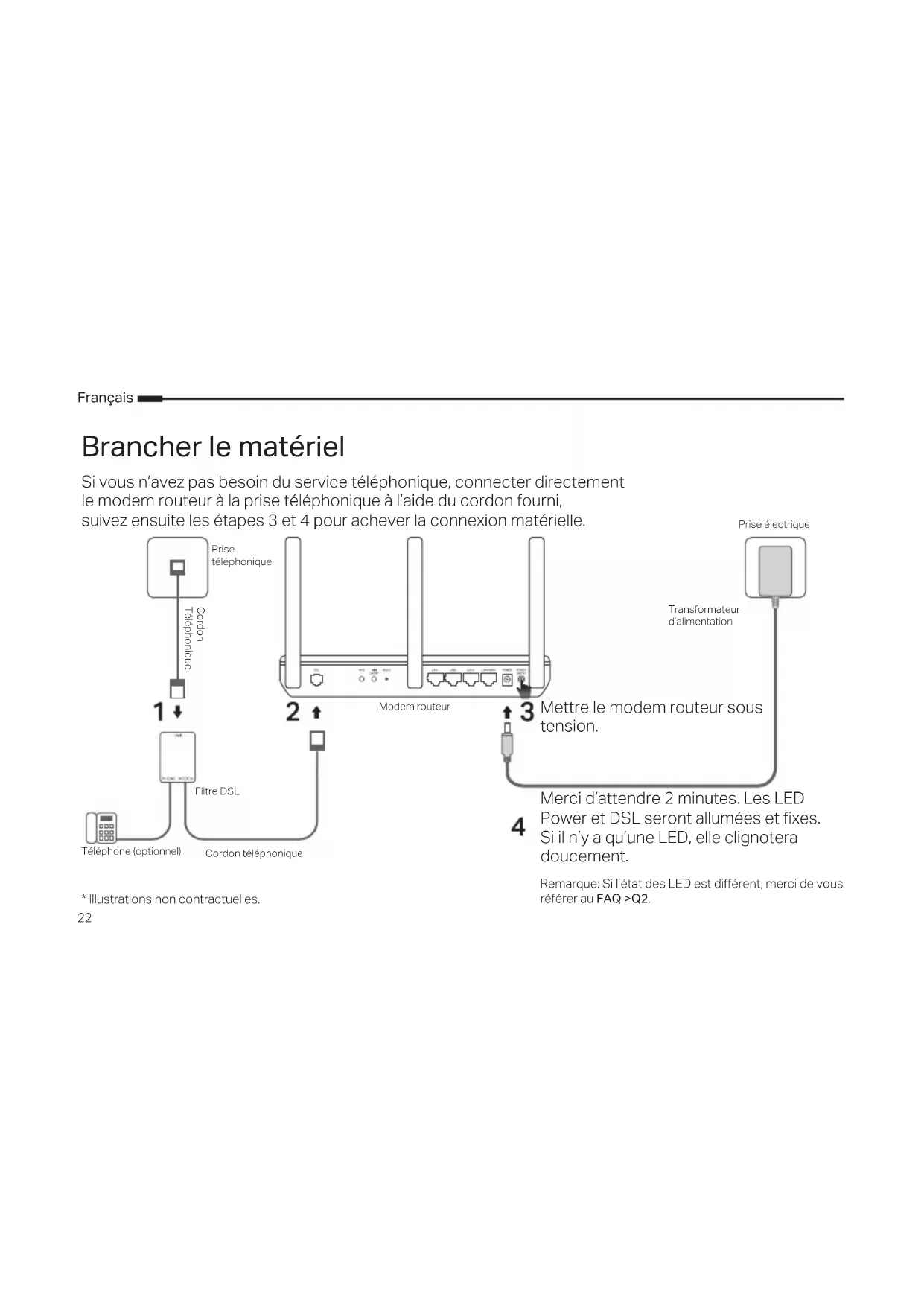 Brancher le matériel Si vous n’avez pas besoin du service téléphonique, connecter directement le modem routeur à la prise téléphonique à l’aide du cordon fourni, suivez ensuite les étapes 3 et 4 pour achever la connexion matérielle.