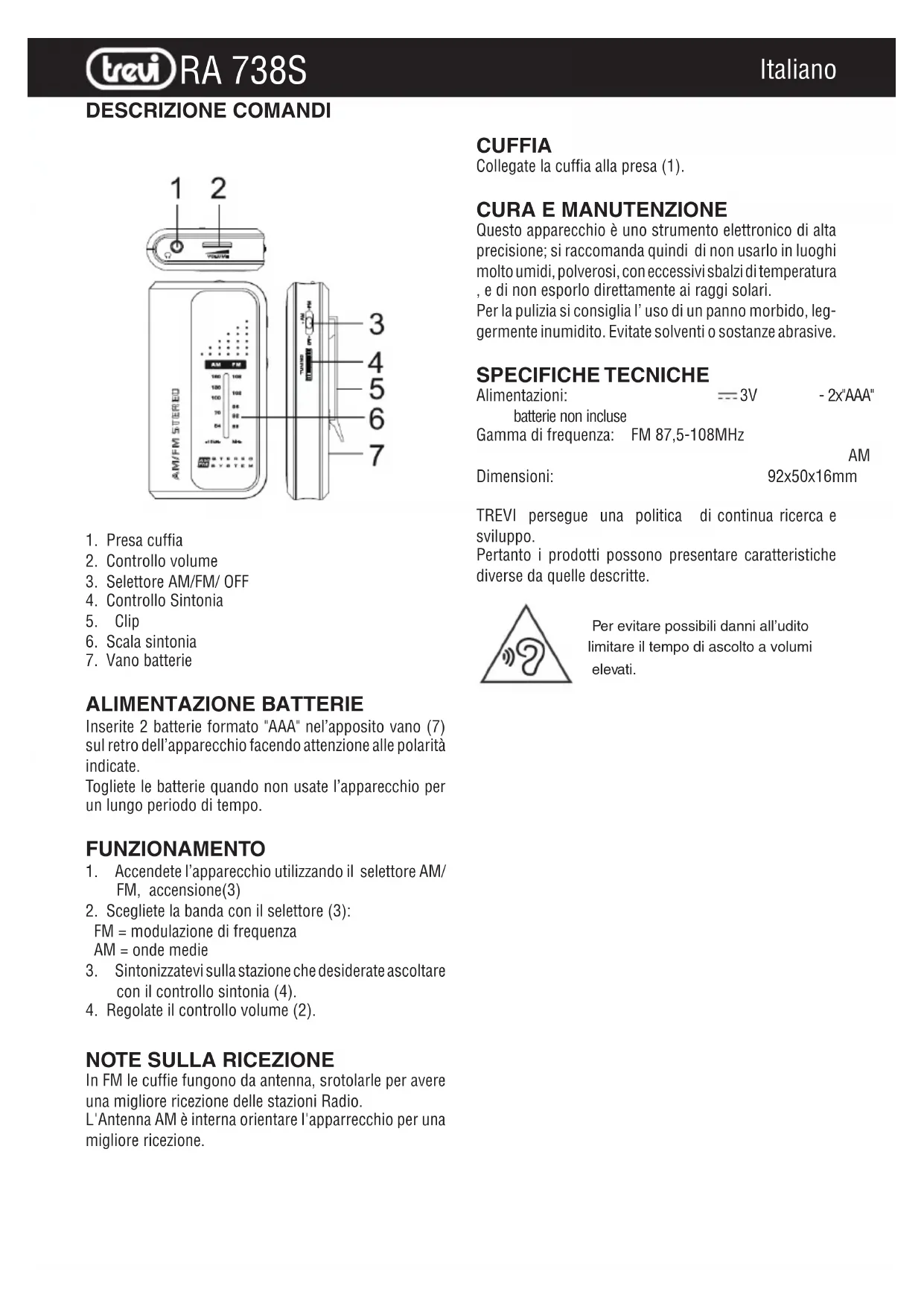 Cet appareil est un instrument électronique de haute préci- sion; il est donc recommandé de ne pas l'utiliser dans un très humide, poussiéreux, avec des différences extrêmes de température, et ne pas l'exposer directement au soleil. Pour le nettoyage, nous recommandons «l'utilisation d'un chiffon doux, légèrement humide. Evitez les solvants ou de produits abrasifs. CARACTERISTIQUES TECHNIQUES Puissance: 3V - 2x piles "AAA" Gamme de fréquences: FM 87,5-108MHz AM 530-1600KHz Taille: 92x50x16mm TREVI poursuit une politique de recherche et de déve- loppement continu. Par conséquent, les produits peuvent présenter des caractéristiques différentes de celles décrites.