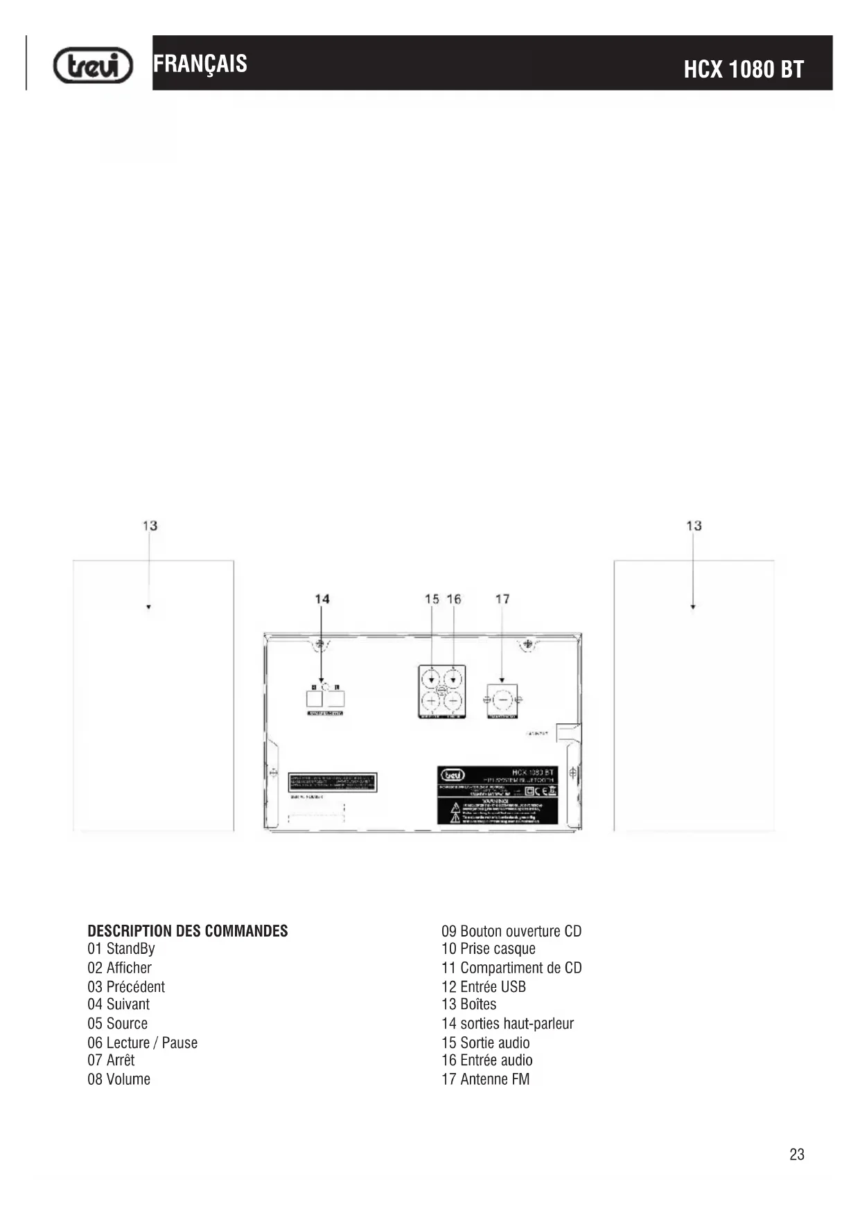 01 StandBy 02 Afcher 03 Précédent 04 Suivant 05 Source 06 Lecture / Pause 07 Arrêt 08 Volume 09 Bouton ouverture CD 10 Prise casque 11 Compartiment de CD 12 Entrée USB 13 Boîtes 14 sorties haut-parleur 15 Sortie audio 16 Entrée audio 17 Antenne FM FRANÇAIS24 HCX 1080 BT