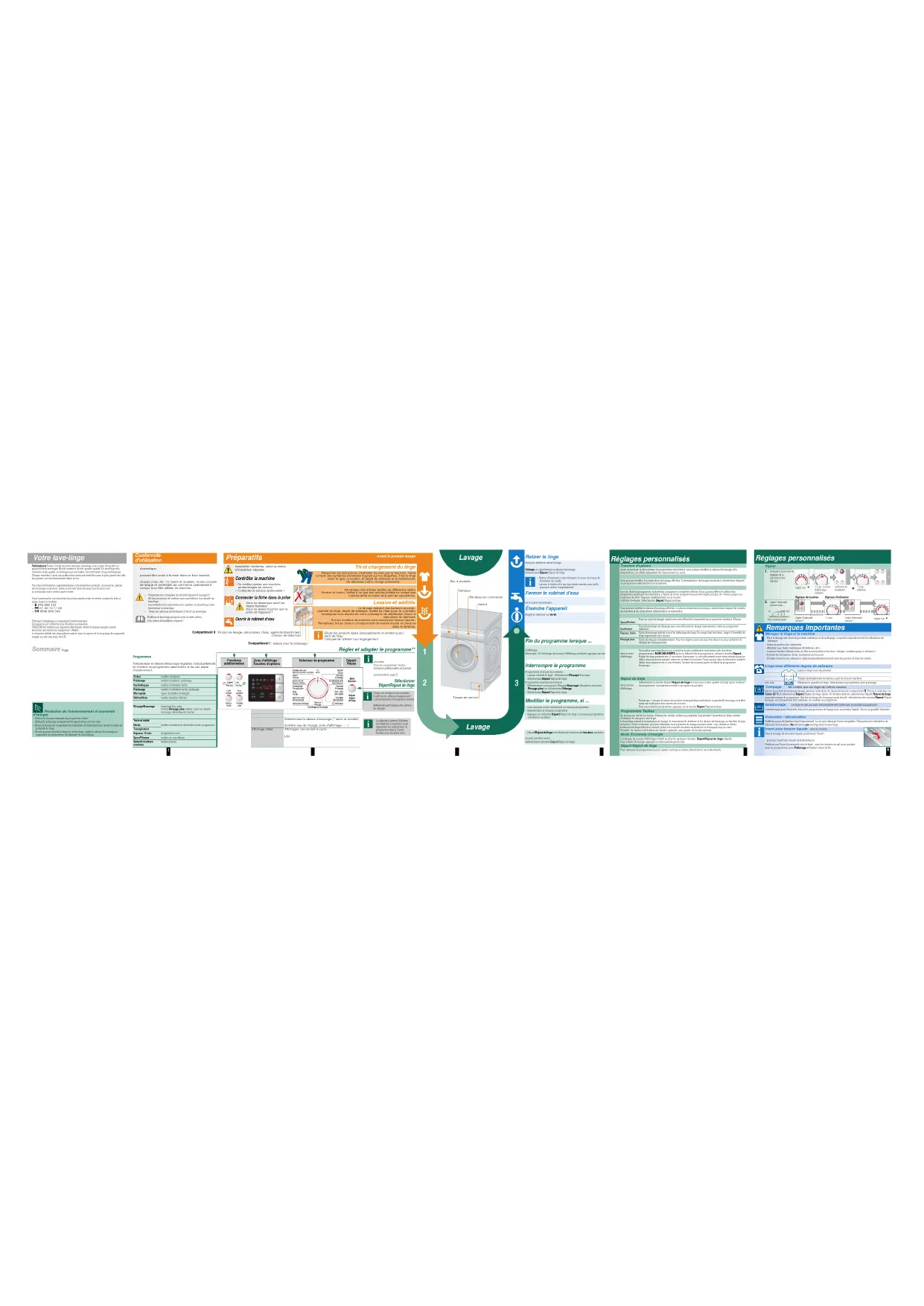 3 TambourBandeau de commandeTrappe de service 1 2 3 4 5 6Insert pour lessive liquide (selon le modèle) apage 61 2 3 4 5 6 ProgrammesRécapitulatif détaillé des programmes apage 7. Température et vitesse d'essorage réglables individuellement, en fonction du programme sélectionné et de son stade d'avancement.Coton textiles résistantsPrélavage textiles résistants, prélavageSynthétiques textiles d'entretien facilePrélavage textiles d'entretien facile, prélavageMix rapide types de textiles mélangésDélicat/Soie textiles lavables délicats ÿ Laine laine lavable à la main/à la machine Rinçage/Essorage linge lavé à la main,touche Rinçage plus activée ; pour un simple essorage, désactivez la touche Vidange de l'eau de rinçage de c(sans essorage final) Terre et sableHerbe textiles résistants et d'entretien facile, programme spécial Taches apage 5TranspirationExpress 15 min programme courtSport/Fitness textiles en microfibresSpécial couleurs sombrestextiles foncés 7 - 90 ºC V(Temp. ºC) Sélection de la température (7] = froid)
