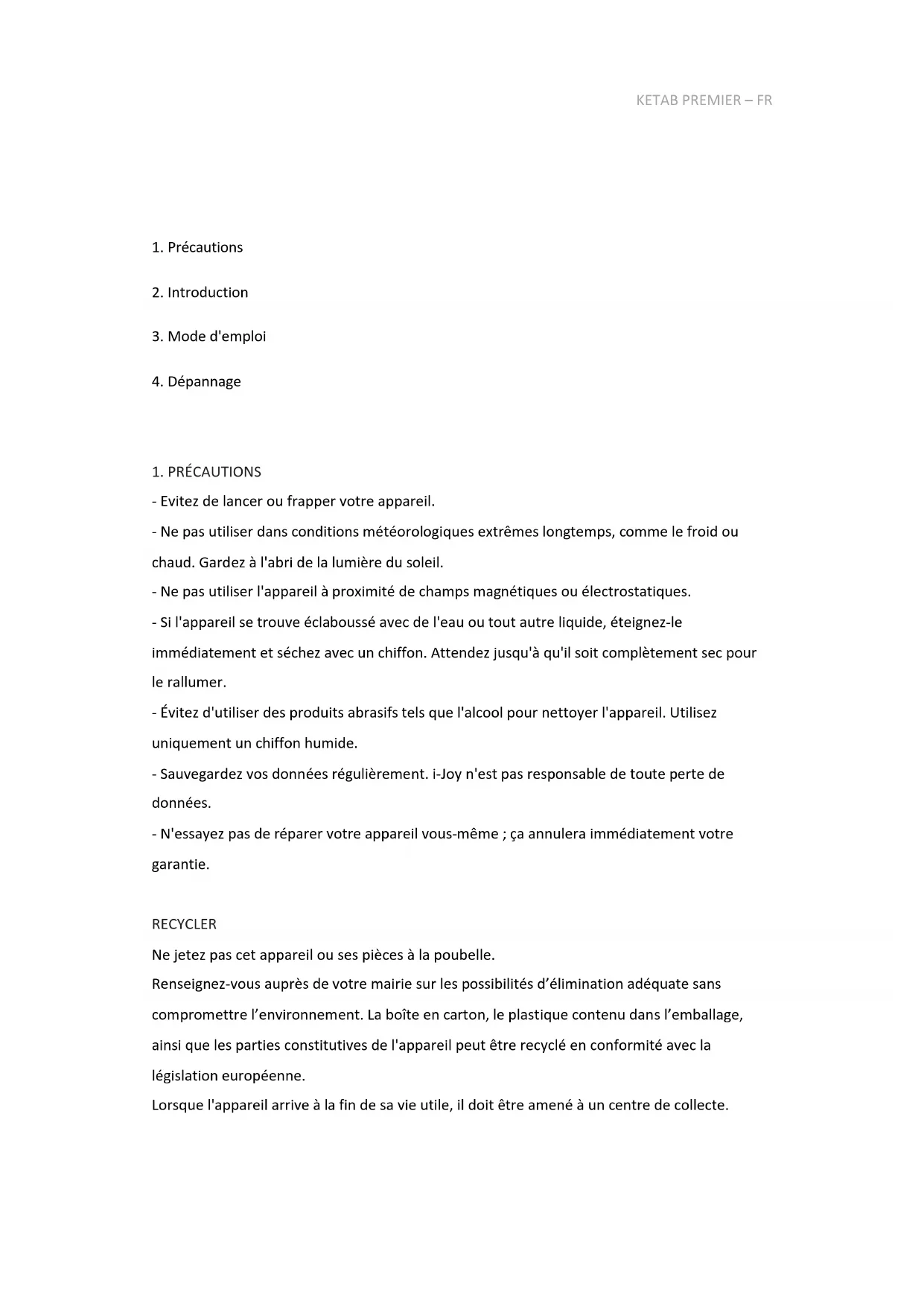 - Evitez de lancer ou frapper votre appareil. - Ne pas utiliser dans conditions météorologiques extrêmes longtemps, comme le froid ou chaud. Gardez à l'abri de la lumière du soleil. - Ne pas utiliser l'appareil à proximité de champs magnétiques ou électrostatiques. - Si l'appareil se trouve éclaboussé avec de l'eau ou tout autre liquide, éteignez-le immédiatement et séchez avec un chiffon. Attendez jusqu'à qu'il soit complètement sec pour le rallumer. - Évitez d'utiliser des produits abrasifs tels que l'alcool pour nettoyer l'appareil. Utilisez uniquement un chiffon humide. - Sauvegardez vos données régulièrement. i-Joy n'est pas responsable de toute perte de données. - N'essayez pas de réparer votre appareil vous-même ; ça annulera immédiatement votre garantie. RECYCLER Ne jetez pas cet appareil ou ses pièces à la poubelle. Renseignez-vous auprès de votre mairie sur les possibilités d’élimination adéquate sans compromettre l’environnement. La boîte en carton, le plastique contenu dans l’emballage, ainsi que les parties constitutives de l'appareil peut être recyclé en conformité avec la législation européenne. Lorsque l'appareil arrive à la fin de sa vie utile, il doit être amené à un centre de collecte.KETAB PREMIER – FR