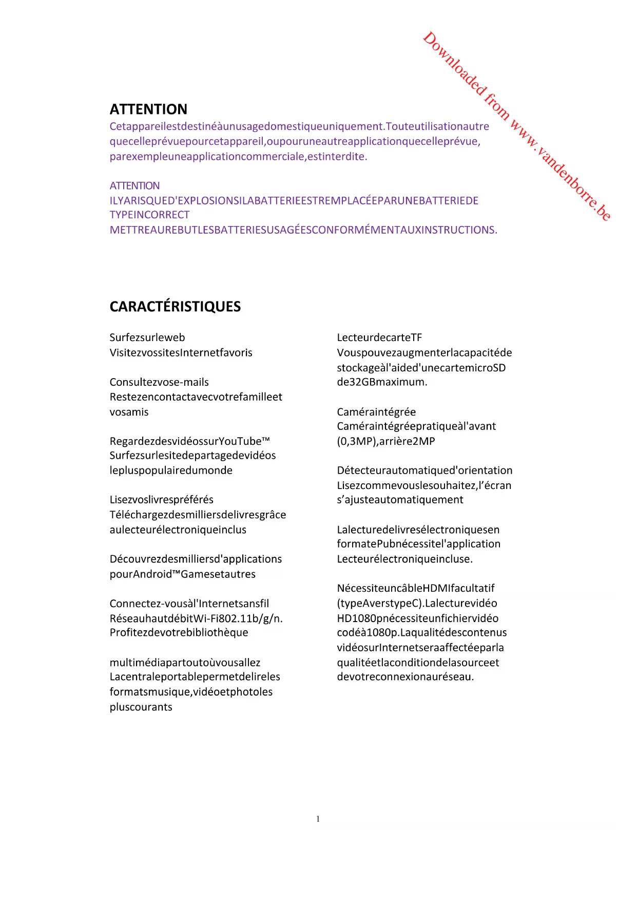 Downloaded from www.vandenborre.be1 ATTENTION Cet appareil est destiné à un usage domestique uniquement. Toute utilisation autre que celle prévue pour cet appareil, ou pour une autre application que celle prévue, par exemple une application commerciale, est interdite. ATTENTION IL Y A RISQUE D'EXPLOSION SI LA BATTERIE EST REMPLACÉE PAR UNE BATTERIE DE TYPE INCORRECT METTRE AU REBUT LES BATTERIES USAGÉES CONFORMÉMENT AUX INSTRUCTIONS. CARACTÉRISTIQUES Surfez sur le web Visitez vos sites Internet favoris Consultez vos e‐mails Restez en contact avec votre famille et vos amis Regardez des vidéos sur YouTube™ Surfez sur le site de partage de vidéos le plus populaire du monde Lisez vos livres préférés Téléchargez des milliers de livres grâce au lecteur électronique inclus Découvrez des milliers d'applications pour Android™ Games et autres Connectez‐vous à l'Internet sans fil Réseau haut débit Wi‐Fi 802.11 b/g/n. Profitez de votre bibliothèque multimédia partout où vous allez La centrale portable permet de lire les formats musique, vidéo et photo les plus courants Lecteur de carte TF Vous pouvez augmenter la capacité de stockage à l'aide d'une carte micro SD de 32 GB maximum. Caméra intégrée Caméra intégrée pratique à l'avant (0,3 MP), arrière 2 MP Détecteur automatique d'orientation Lisez comme vous le souhaitez, l’écran s’ajuste automatiquement La lecture de livres électroniques en format ePub nécessite l'application Lecteur électronique incluse. Nécessite un câble HDMI facultatif (type A vers type C). La lecture vidéo HD 1080p nécessite un fichier vidéo codé à 1080p. La qualité des contenus vidéo sur Internet sera affectée par la qualité et la condition de la source et de votre connexion au réseau. Downloaded from www.vandenborre.be2 DESCRIPTION