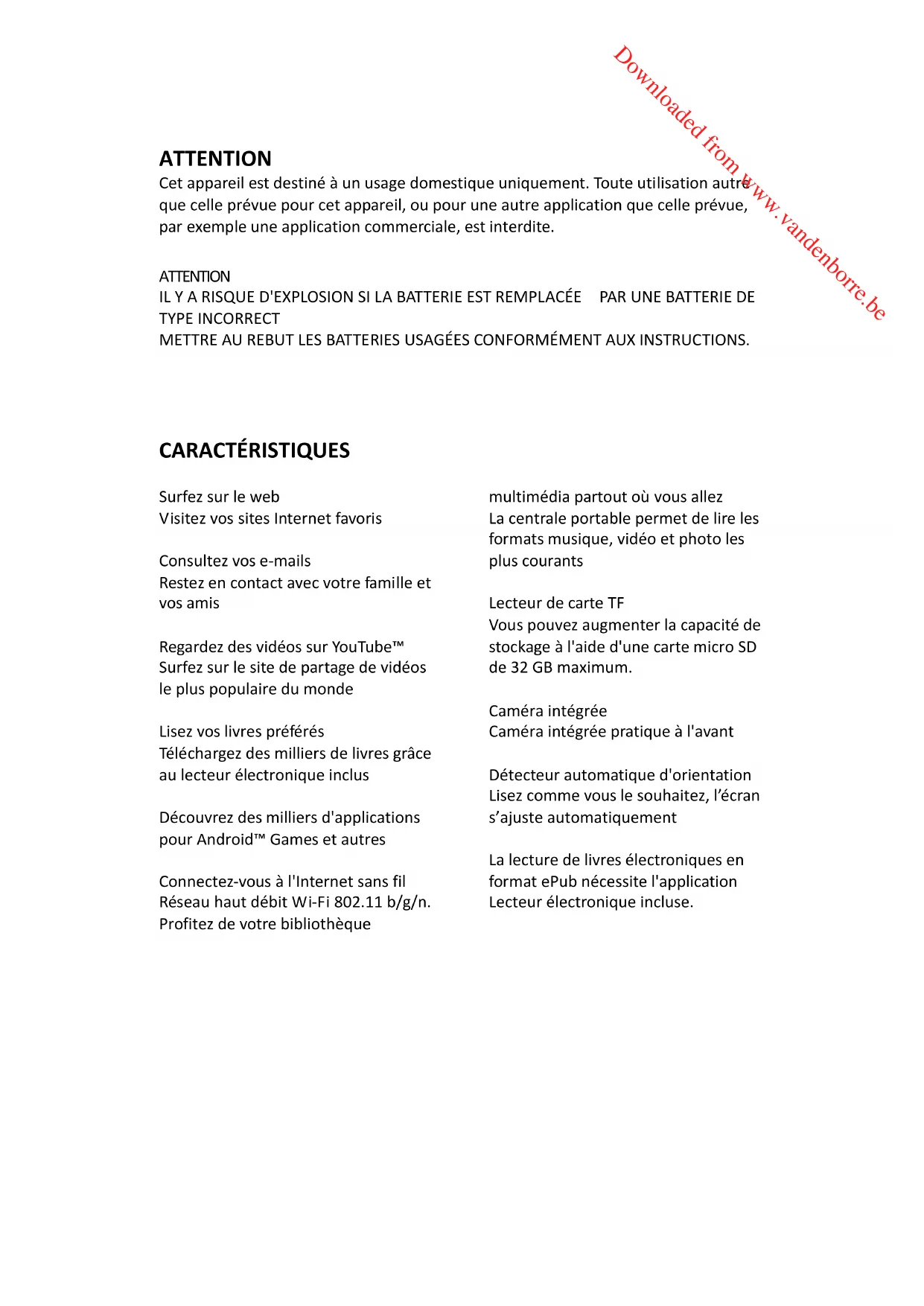 | Caractéristiques techniques | Écran tactile de 10,1 pouces, résolution 1280 x 800 pixels, processeur quad-core, 2 Go de RAM, 32 Go de stockage interne extensible via microSD. |