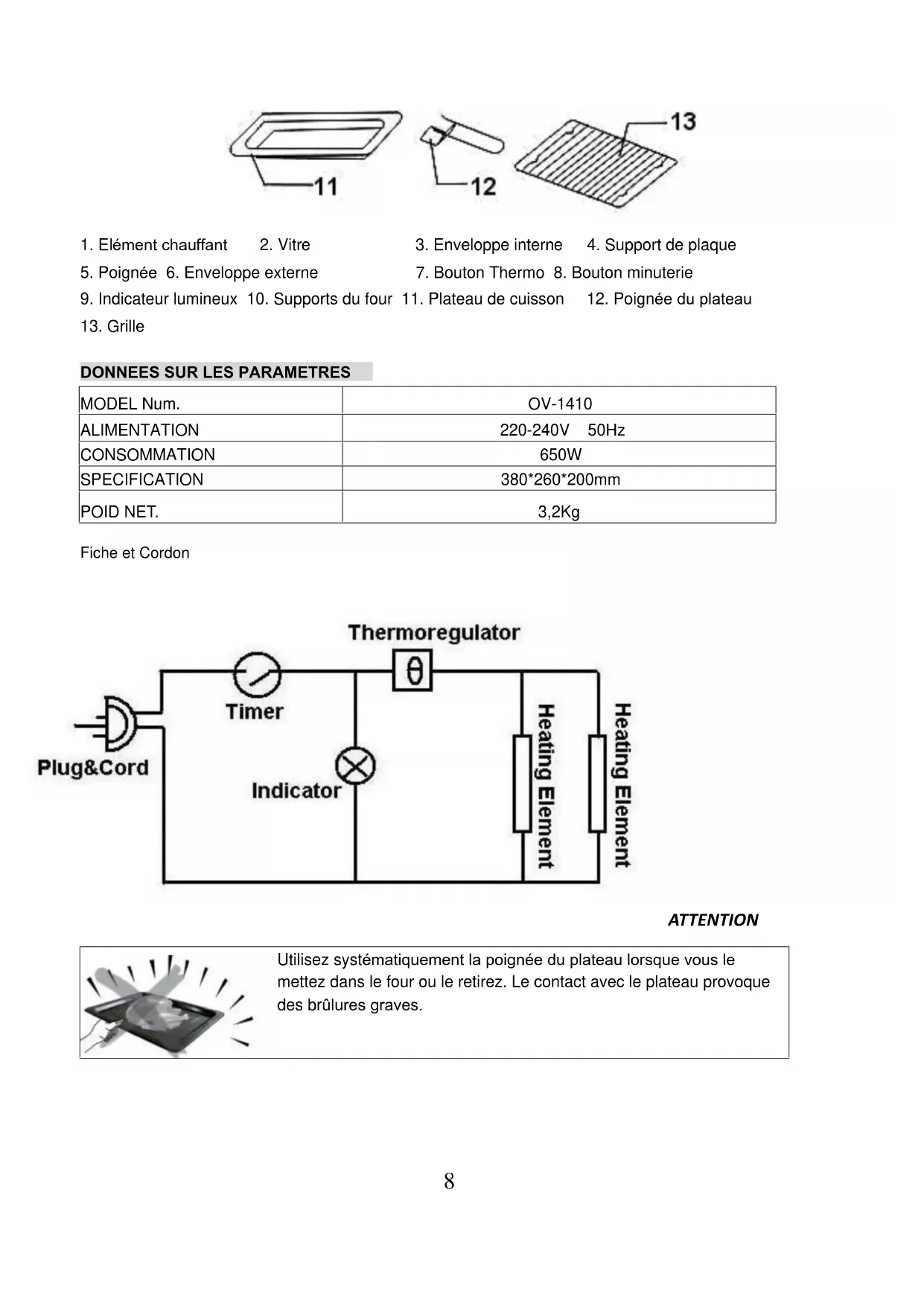 ATTENTION Utilisez systématiquement la poignée du plateau lorsque vous le mettez dans le four ou le retirez. Le contact avec le plateau provoque des brûlures graves. MODEL Num. OV-1410 ALIMENTATION 220-240V 50Hz CONSOMMATION 650W SPECIFICATION 380*260*200mm POID NET. 3,2Kg9 Lorsqu’elle est chaude, ne jetez pas d’eau sur la vitre de la porte. Cela risquerait de la faire se briser. Lorsque vous débranchez la prise, tirez la fiche et non le cordon. Ne tirez jamais sur le cordon, vous risquez d’endommager les câbles qui se trouvent à l’intérieur.