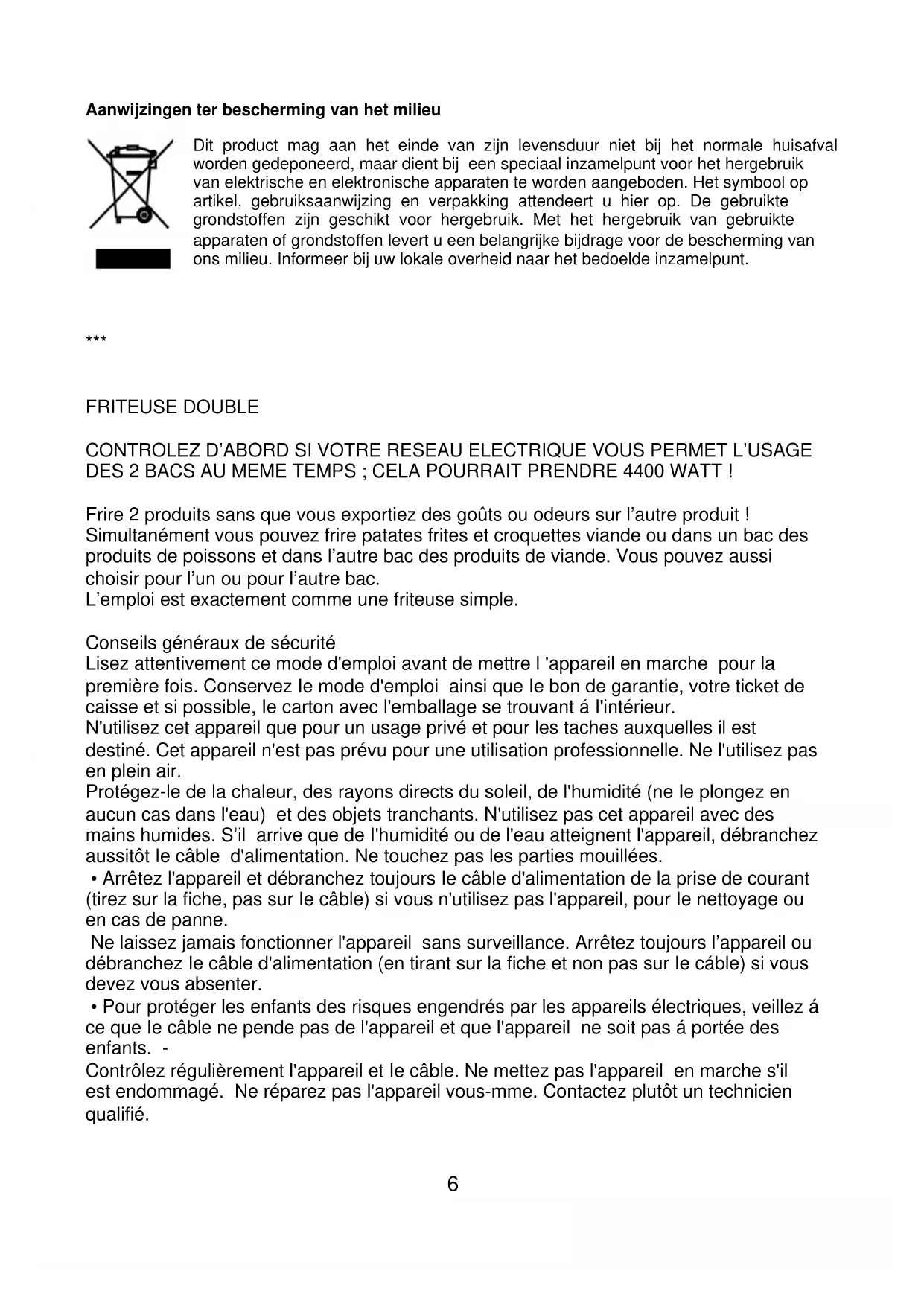 FRITEUSE DOUBLE CONTROLEZ D’ABORD SI VOTRE RESEAU ELECTRIQUE VOUS PERMET L’USAGE DES 2 BACS AU MEME TEMPS ; CELA POURRAIT PRENDRE 4400 WATT !