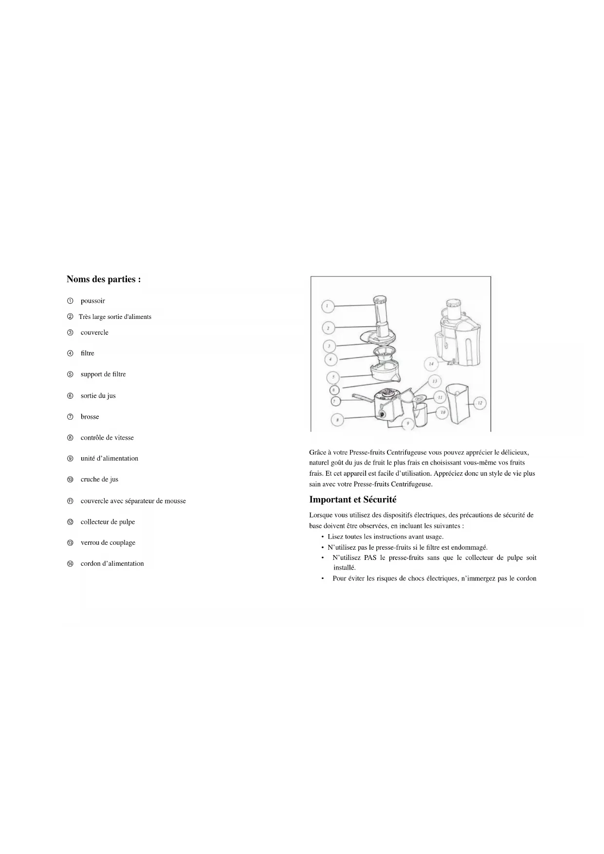 Grâce à votre Presse-fruits Centrifugeuse vous pouvez apprécier le délicieux, naturel goût du jus de fruit le plus frais en choisissant vous-même vos fruits frais. Et cet appareil est facile d’utilisation. Appréciez donc un style de vie plus sain avec votre Presse-fruits Centrifugeuse. Important et Sécurité Lorsque vous utilisez des dispositifs électriques, des précautions de sécurité de base doivent être observées, en incluant les suivantes :