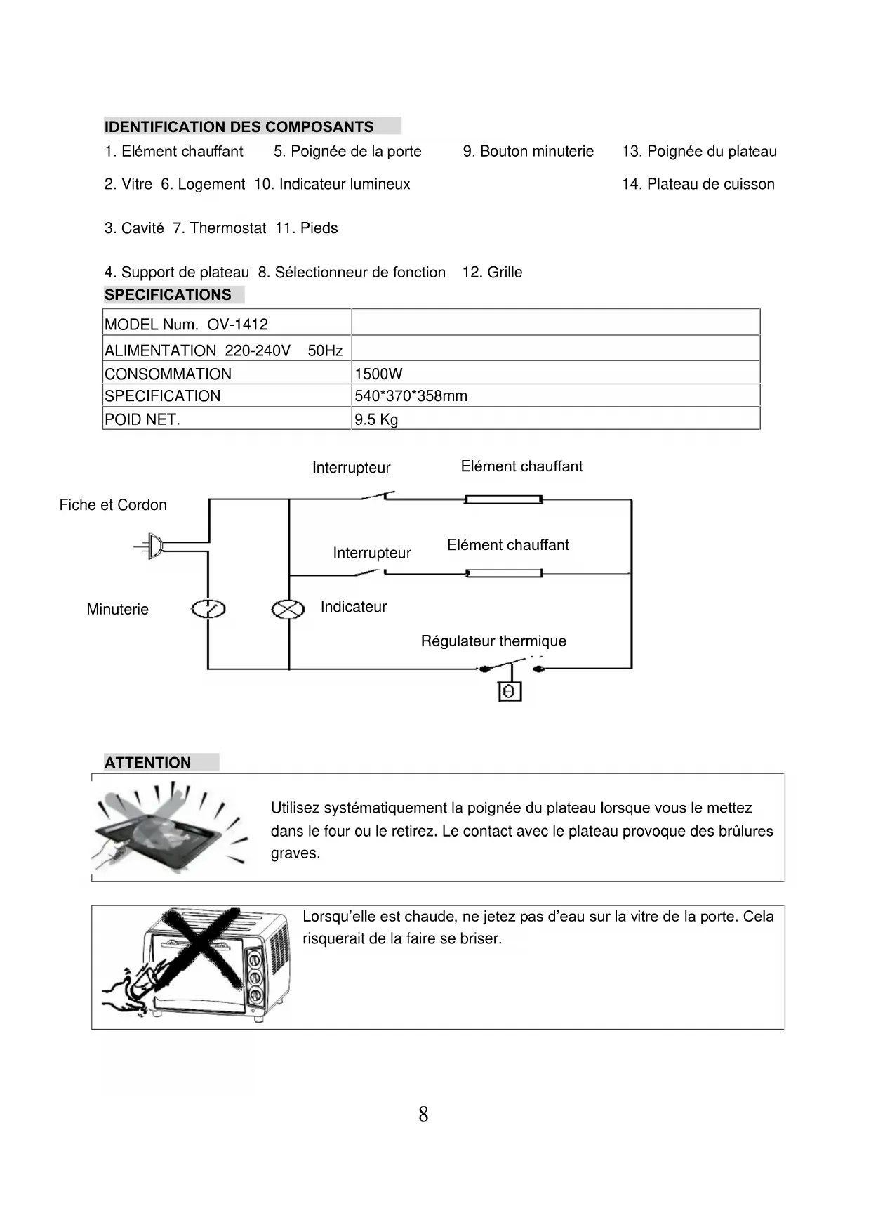 ATTENTION Utilisez systématiquement la poignée du plateau lorsque vous le mettez dans le four ou le retirez. Le contact avec le plateau provoque des brûlures graves. Lorsqu’elle est chaude, ne jetez pas d’eau sur la vitre de la porte. Cela risquerait de la faire se briser. MODEL Num. OV-1412 ALIMENTATION 220-240V 50Hz CONSOMMATION 1500W SPECIFICATION 540*370*358mm POID NET. 9.5 Kg Fiche et Cordon Interrupteur Elément chauffant Minuterie Indicateur Interrupteur Elément chauffant Régulateur thermique9 Lorsque vous débranchez la prise, tirez la fiche et non le cordon. Ne tirez jamais sur le cordon, vous risquez d’endommager les câbles qui se trouvent à l’intérieur. Ne placez pas l’appareil à proximité d’un bec de gaz ou d’autres sources de températures élevées, ne dirigez pas de ventilateurs électriques ou d’appareils similaires vers le fous lorsque vous l’utilisez. Vous risqueriez de gêner le bon fonctionnement du contrôle de température.
