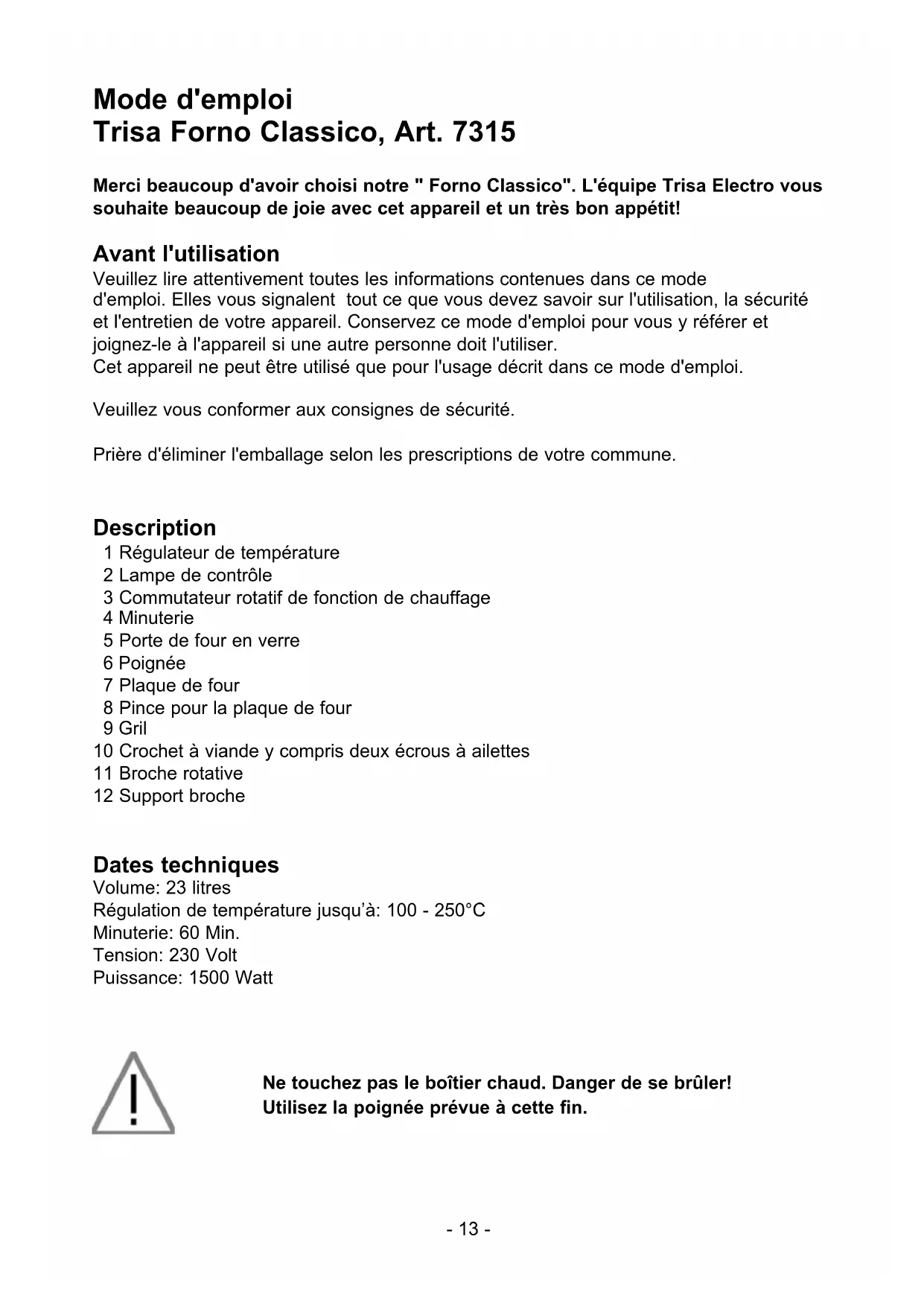 Mode d'emploi Trisa Forno Classico, Art. 7315