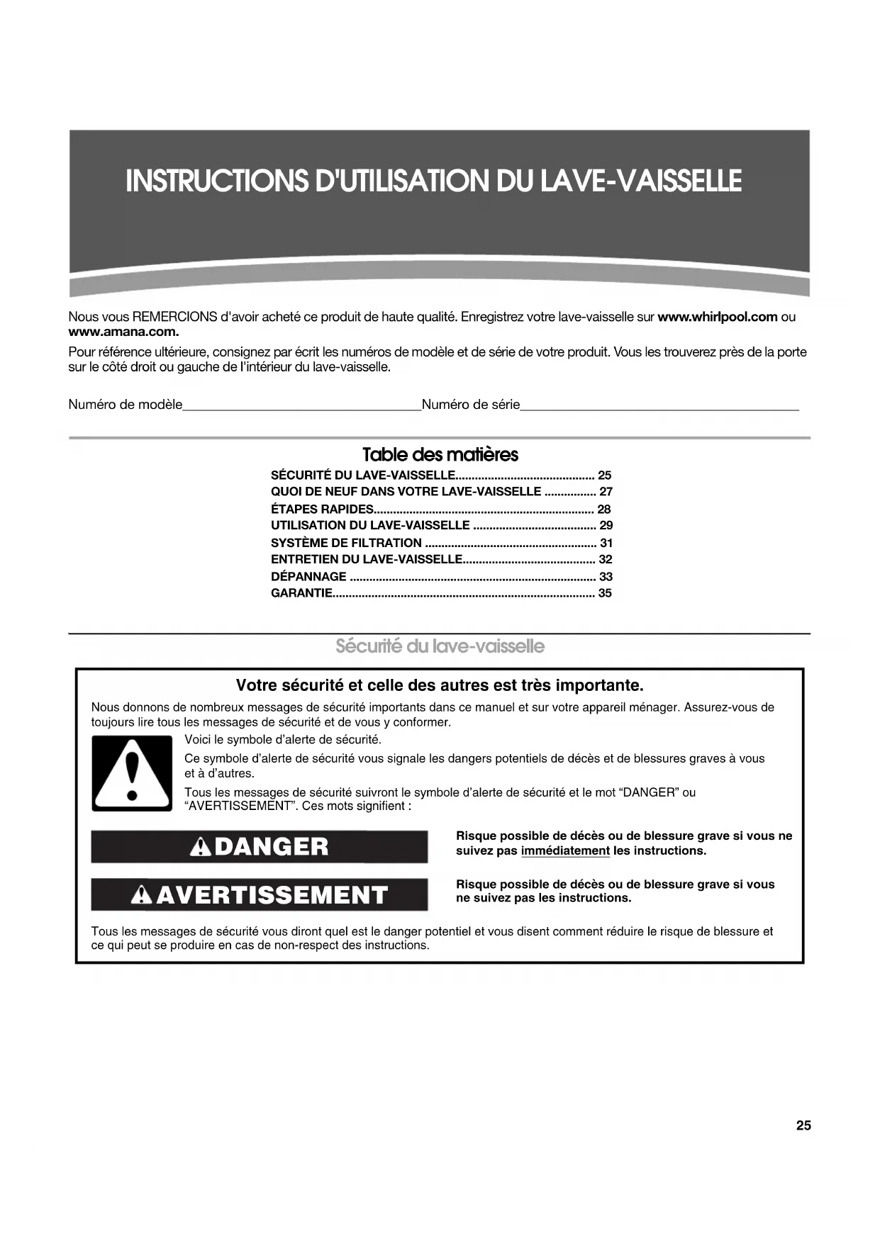 - Table des matières SÉCURITÉ DU LAVE-VAISSELLE p. 25