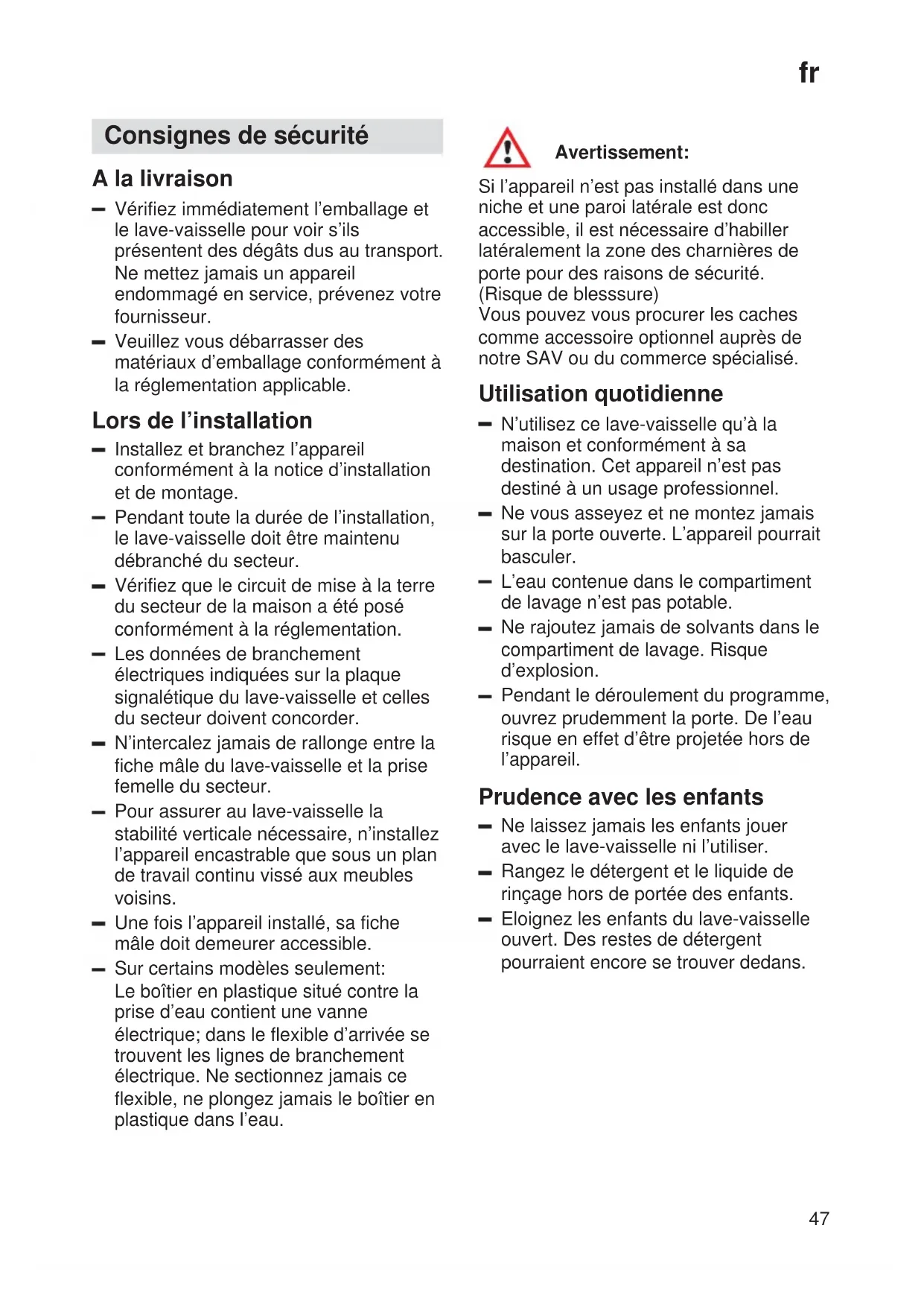 Si l’appareil n’est pas installé dans une niche et une paroi latérale est donc accessible, il est nécessaire d’habiller latéralement la zone des charnières de porte pour des raisons de sécurité. (Risque de blesssure) Vous pouvez vous procurer les caches comme accessoire optionnel auprès de notre SAV ou du commerce spécialisé. Utilisation quotidienne N’utilisez ce lave-vaisselle qu’à la maison et conformément à sa destination. Cet appareil n’est pas destiné à un usage professionnel. Ne vous asseyez et ne montez jamais sur la porte ouverte. L’appareil pourrait basculer. L’eau contenue dans le compartiment de lavage n’est pas potable. Ne rajoutez jamais de solvants dans le compartiment de lavage. Risque d’explosion. Pendant le déroulement du programme, ouvrez prudemment la porte. De l’eau risque en effet d’être projetée hors de l’appareil. Prudence avec les enfants Ne laissez jamais les enfants jouer avec le lave-vaisselle ni l’utiliser. Rangez le détergent et le liquide de rinçage hors de portée des enfants. Eloignez les enfants du lave-vaisselle ouvert. Des restes de détergent pourraient encore se trouver dedans.fr