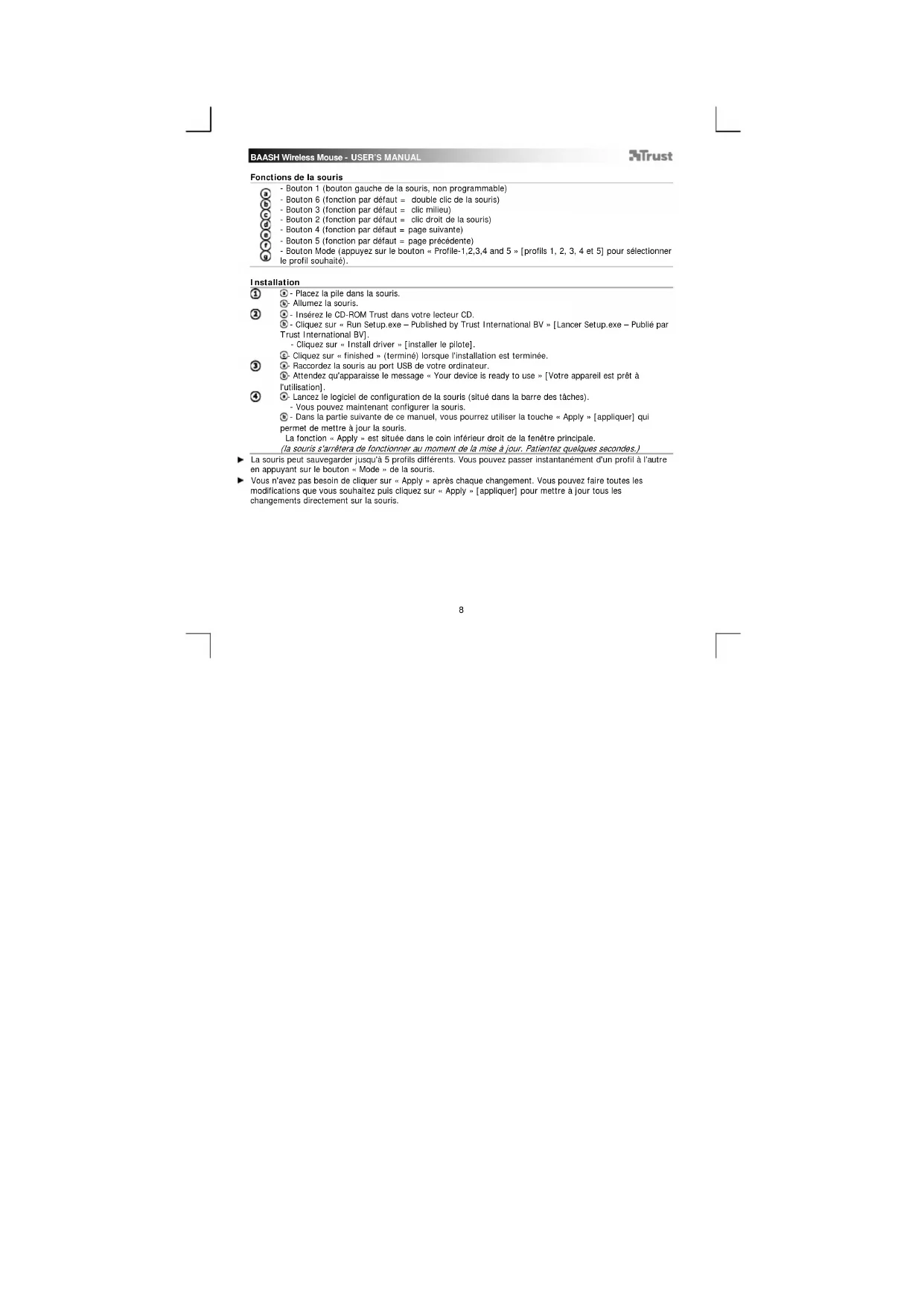 - Dans la partie suivante de ce manuel, vous pourrait utiliser la touche « Apply » [appliquer] qui permet demettre à jour la souris.