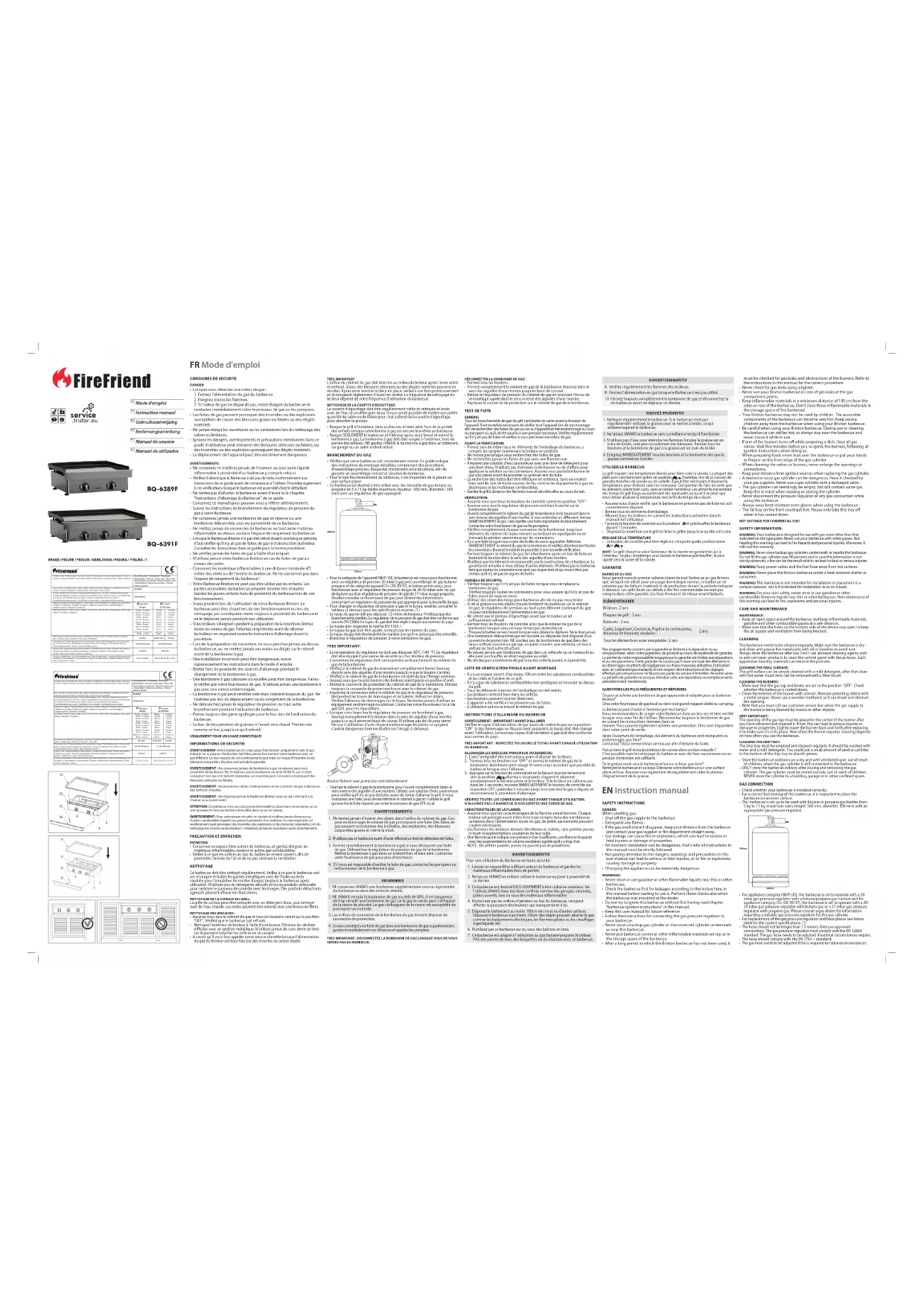 comme un bac jusqu'à ce qu'il refroidi UNIQUEMENT POUR UN USAGE DOMESTIQUE! INFORMATIONS DE SECURITE: AVERTISSEMENT : Votre barbecue est conçu pour fonctionner uniquement avec le gaz indiqué sur la plaque d'indication. Ne faites jamais fonctionner votre barbecue avec un gaz différent. Le non respect de cet avertissement peut créer un risque d'incendie ou de blessures corporelles. De plus, ceci annule la garantie.AVERTISSEMENT : Ne conservez jamais de bonbonne à gaz en réserve sous ou à proximité du barbecue. Ne remplissez pas la bonbonne au-delà de 80 %, car si cette consigne n’est pas strictement respectée, un incendie peut s’ensuivre provoquant des blessures sérieuses ou fatales.AVERTISSEMENT : Maintenez les câbles d'alimentation et les conduits de gaz à distances des surfaces chaudes.AVERTISSEMENT : Ne disposez jamais le Barbecue Brixton sous un abri résistant à la chaleur ou un pare-soleil. ATTENTION : Ce barbecue n'est pas conçu pour être installé ou placé dans un camping-car ou une caravane et n'est pas destiné à être utilisé dans ou sur un bateau. AVERTISSEMENT : Pour votre propre sécurité, ne stockez ni n'utilisez jamais d'essence ou d'autres combustibles liquides ou gazeux à proximité d'un barbecue. Le non respect de cet avertissement peut provoquer des incendies, des explosions et des blessures corporelles.Lors du nettoyage des vannes ou des brûleurs, n'élargissez jamais les ouvertures ou les branchements. PRECAUTION ET ENTRETIEN ENTRETIEN: • Conservez un espace libre autour du barbecue, et gardez éloignés les