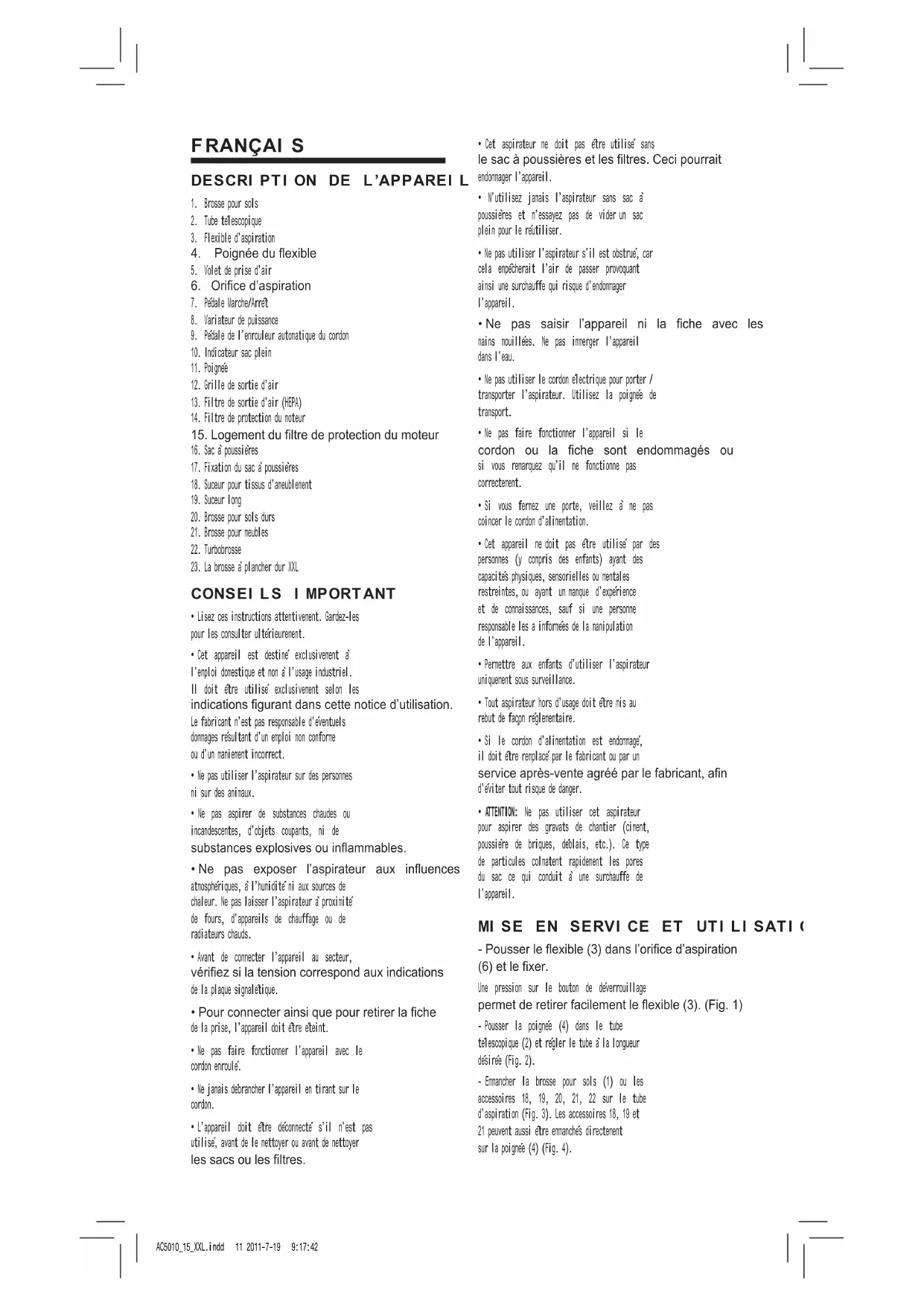 sortant.(Fig.19) ACCESSOIRES Suceur pour tissus d’ameublement (18) Accessoire pour aspirer sur des meubles rembourrés. Suceur long (19) Accessoirepouraspirerdanslesjoints,rainures, fentesetc. Brosse pour sols durs (20) Pour aspirer sur des sols lisses (parquets, carrelages,dallesdeterrecuiteetc.).Lespoilsde la brosse passent doucement sur la surface en ramassantlapoussièresansabîmerlesol. Brosse pour meubles (21) Pour aspirer sur des meubles et d’autres surfacesfragilestoutenévitantdelesabîmer. AC5010_15_XXL.indd 12 2011-7-19 9:17:43TURBOBROSSE POUR TAPIS & MOQUETTES (22) (uniquement pour le AC5015) Brossage et dépoussiérage, en un seul mouvement,detapisetmoquettesàpoilscourts.