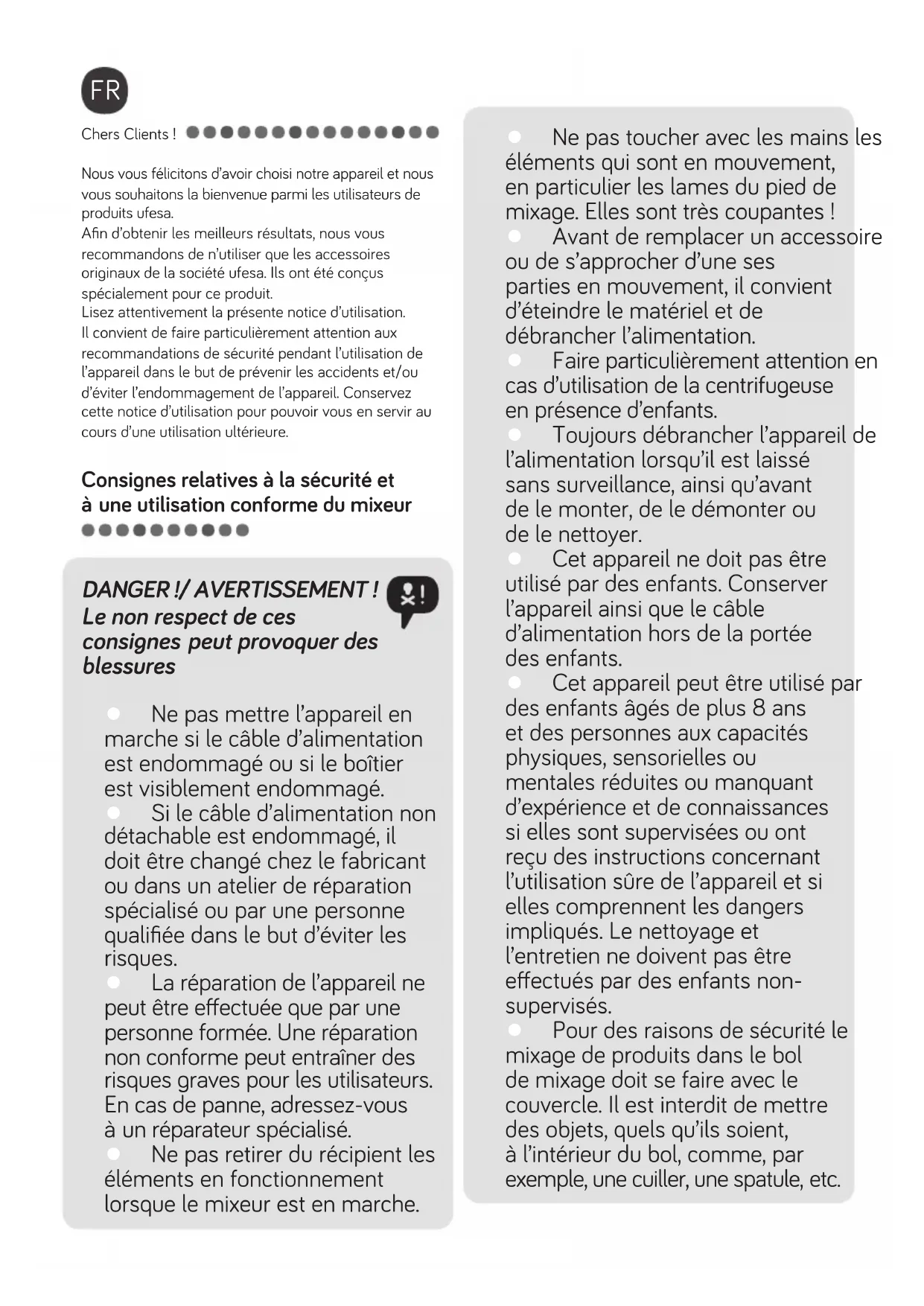 Soup for infants mixing adapter 1 litre I position 10 s, next V position 40 – 60 s Vegetable puree for infants mixing adapter 0,5 litre I position 10 s, next V position 1 – 1,5 min. liquidizing disc I position (with a sieve) Cream soup mixing adapter 1 litre I position 10 s, next V position 30 – 45 s mixing cup 0,5 litre IV position or V position 2 min. Fruit latte mixing adapter 0,5 litre V position 30 – 60 s mixing cup 0,15 kg of fruit and 0,3 litre of kefir IV position or V position 1 – 1,5 min. Greens: parsley, dill … mixing adapter 1 bundle II position 30 s Pancake dough whisks 1 litre I position 15 s, next V position 1 – 1,5 min. mixing cup 0,5 litre III, IV or V position 1 min. Egg white foam whisks White of 5 eggs V position 2 – 3 min. Sponge cake dough whisks Made of 6 eggs IV position 7 – 8 min. Butter cream whisks 0,25 kg of vegetable butter III or IV position 4 – 5 min. Whipped cream whisks 1 litre II position 15 s, next IV position Potatoes puree whisks 1 kg I position 15 s, next V position 40 – 60 s Potatoes and cheese dumplings stung whisks 1 kg of potatoes and 0,5 kg of cottage cheese position 15 s, next IV position 40 – 60 s Cottage cheese with cream whisks 0,5 kg III position 45 – 60 s Gingerbread dough watery whisks 0,5 kg of flour I position 30 s, next III position 4 – 5 min. dense mixers Yeast dough mixers 0,5 kg of flour I position 30 s next V position 7 – 8 min.Chers Clients ! Nous vous félicitons d’avoir choisi notre appareil et nous vous souhaitons la bienvenue parmi les utilisateurs de produits ufesa. Afin d’obtenir les meilleurs résultats, nous vous recommandons de n’utiliser que les accessoires originaux de la société ufesa. Ils ont été conçus spécialement pour ce produit. Lisez attentivement la présente notice d’utilisation. Il convient de faire particulièrement attention aux recommandations de sécurité pendant l’utilisation de l’appareil dans le but de prévenir les accidents et/ou d’éviter l’endommagement de l’appareil. Conservez cette notice d’utilisation pour pouvoir vous en servir au cours d’une utilisation ultérieure. Consignes relatives à la sécurité et àune utilisation conforme du mixeur ● Ne pas toucher avec les mains les éléments qui sont en mouvement, en particulier les lames du pied de mixage. Elles sont très coupantes ! ● Avant de remplacer un accessoire ou de s’approcher d’une ses parties en mouvement, il convient d’éteindre le matériel et de débrancher l’alimentation. ● Faire particulièrement attention en cas d’utilisation de la centrifugeuse en présence d’enfants. ● Toujours débrancher l’appareil de l’alimentation lorsqu’il est laissé sans surveillance, ainsi qu’avant de le monter, de le démonter ou de le nettoyer. ● Cet appareil ne doit pas être utilisé par des enfants. Conserver l’appareil ainsi que le câble d’alimentation hors de la portée des enfants. ● Cet appareil peut être utilisé par des enfants âgés de plus 8 ans et des personnes aux capacités physiques, sensorielles ou mentales réduites ou manquant d’expérience et de connaissances si elles sont supervisées ou ont reçu des instructions concernant l’utilisation sûre de l’appareil et si elles comprennent les dangers impliqués. Le nettoyage et l’entretien ne doivent pas être eectués par des enfants non- supervisés. ● Pour des raisons de sécurité le mixage de produits dans le bol de mixage doit se faire avec le couvercle. Il est interdit de mettre des objets, quels qu’ils soient, à l’intérieur du bol, comme, par exemple, une cuiller, une spatule,etc. DANGER !/ AVERTISSEMENT ! Le non respect de ces consignespeut provoquer des blessures ● Ne pas mettre l’appareil en marche si le câble d’alimentation est endommagé ou si le boîtier est visiblement endommagé. ● Si le câble d’alimentation non détachable est endommagé, il doit être changé chez le fabricant ou dans un atelier de réparation spécialisé ou par une personne qualifiée dans le but d’éviter les risques. ● La réparation de l’appareil ne peut être eectuée que par une personne formée. Une réparation non conforme peut entraîner des risques graves pour les utilisateurs. En cas de panne, adressez-vous àun réparateur spécialisé. ● Ne pas retirer du récipient les éléments en fonctionnement lorsque le mixeur est en marche. FRDonnées techniques Les paramètres techniques de l’appareil figurent sur la plaque signalétique du produit.Temps de fonctionnement du bloc moteur : – avec les batteurs, les fouets 10 minutes – avec le pied ou le bol de mixage 3 minutesTemps de repos avant un nouvel usage 20 minutesBruit de l’appareil (L