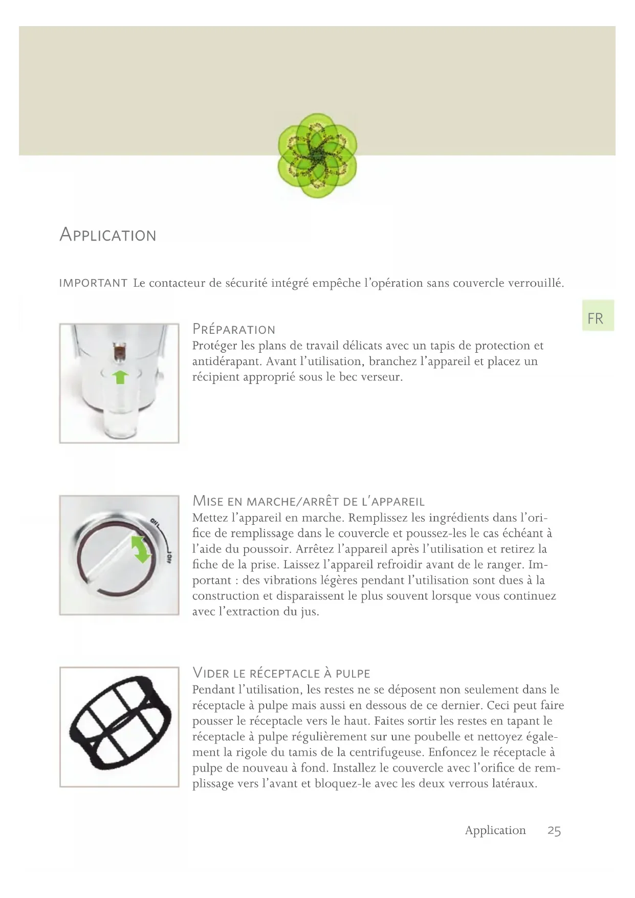Mettez l'appareil en marche. Remplissez les ingrédients dans l'orifice de remplissage dans le couvercle et poussez-les le cas échéant à l'aide du pouvoir. Arrêtez l'appareil après l'utilisation et retirez la fiche de la prise. Laissez l'appareil refroidir avant de le ranger. Important : des vibrations légères pendant l'utilisation sont dues à la construction et disparaisent le plus souvent lorsque vous continuez avec l'extraction du jus.