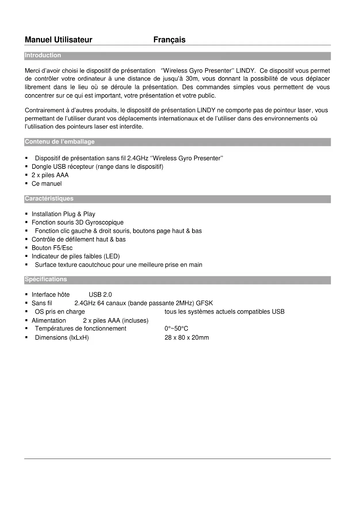 drücken. Dadurch werden Presenter & Empfänger auf einen anderen Kanal umgeschaltet. Ein Aus ResetManuel Utilisateur Français Introduction Merci d’avoir choisi le dispositif de présentation ‘’Wireless Gyro Presenter’’ LINDY. Ce dispositif vous permet de contrôler votre ordinateur à une distance de jusqu’à 30m, vous donnant la possibilité de vous déplacer librement dans le lieu où se déroule la présentation. Des commandes simples vous permettent de vous concentrer sur ce qui est important, votre présentation et votre public. Contrairement à d’autres produits, le dispositif de présentation LINDY ne comporte pas de pointeur laser, vous permettant de l’utiliser durant vos déplacements internationaux et de l’utiliser dans des environnements où l’utilisation des pointeurs laser est interdite. Contenu de l’emballage Dispositif de présentation sans fil 2.4GHz ‘’Wireless Gyro Presenter’’ Dongle USB récepteur (range dans le dispositif) 2 x piles AAA Ce manuel Caractéristiques Installation Plug & Play Fonction souris 3D Gyroscopique Fonction clic gauche & droit souris, boutons page haut & bas Contrôle de défilement haut & bas Bouton F5/Esc Indicateur de piles faibles (LED) Surface texture caoutchouc pour une meilleure prise en main Spécifications Interface hôte USB 2.0 Sans fil 2.4GHz 64 canaux (bande passante 2MHz) GFSK OS pris en charge tous les systèmes actuels compatibles USB Alimentation 2 x piles AAA (incluses) Températures de fonctionnement 0°~50°C Dimensions (lxLxH) 28 x 80 x 20mmManuel Utilisateur Français