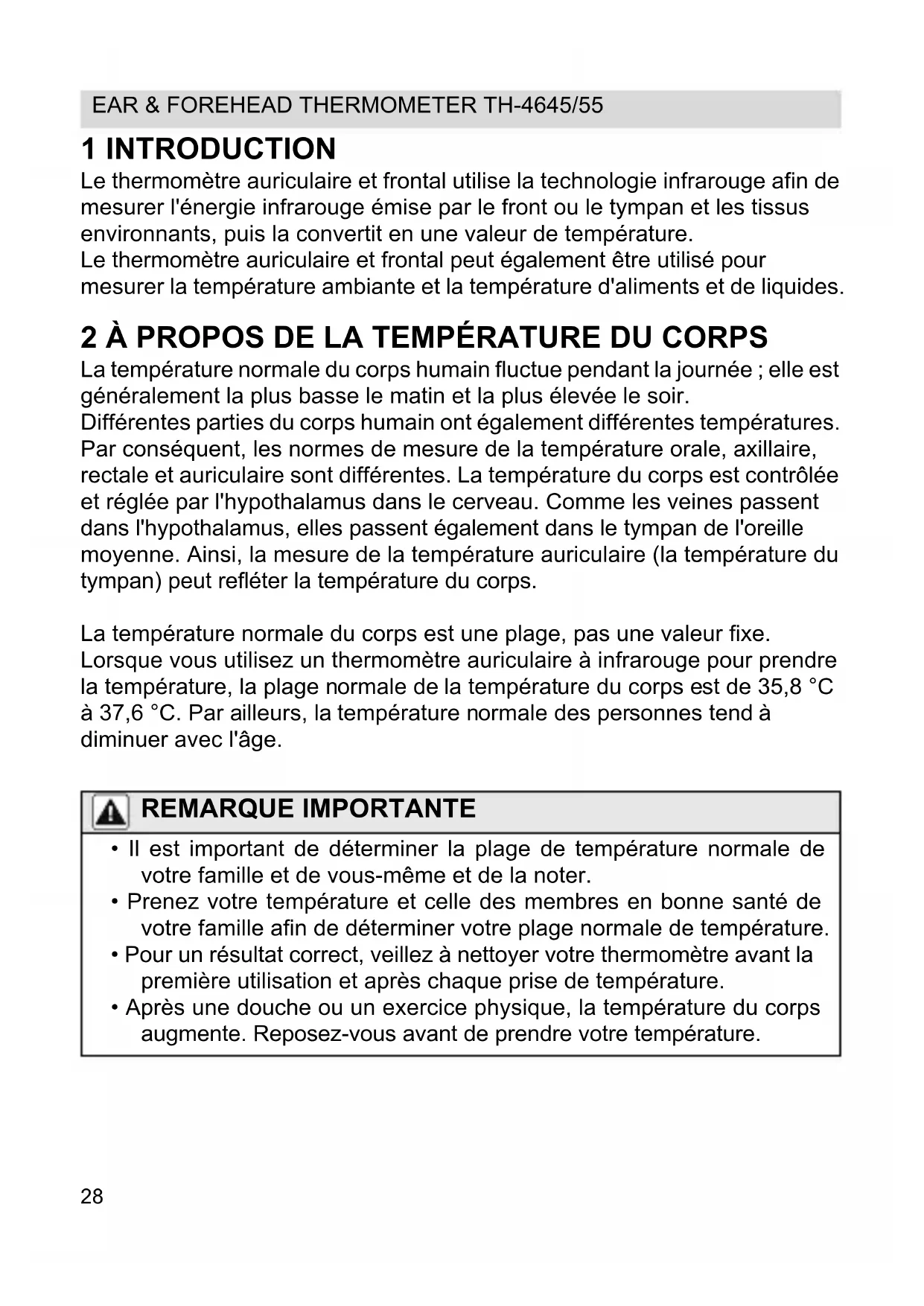1 INTRODUCTION Le thermomètre auriculaire et frontal utilise la technologie infrarouge afin de mesurer l'énergie infrarouge émise par le front ou le tympan et les tissus environnants, puis la convertit en une valeur de température. Le thermomètre auriculaire et frontal peut également être utilisé pour mesurer la température ambiante et la température d'aliments et de liquides. 2 À PROPOS DE LA TEMPÉRATURE DU CORPS La température normale du corps humain fluctue pendant la journée ; elle est généralement la plus basse le matin et la plus élevée le soir. Différentes parties du corps humain ont également différentes températures. Par conséquent, les normes de mesure de la température orale, axillaire, rectale et auriculaire sont différentes. La température du corps est contrôlée et réglée par l'hypothalamus dans le cerveau. Comme les veines passent dans l'hypothalamus, elles passent également dans le tympan de l'oreille moyenne. Ainsi, la mesure de la température auriculaire (la température du tympan) peut refléter la température du corps. La température normale du corps est une plage, pas une valeur fixe. Lorsque vous utilisez un thermomètre auriculaire à infrarouge pour prendre la température, la plage normale de la température du corps est de 35,8 °C à 37,6 °C. Par ailleurs, la température normale des personnes tend à diminuer avec l'âge. REMARQUE IMPORTANTE