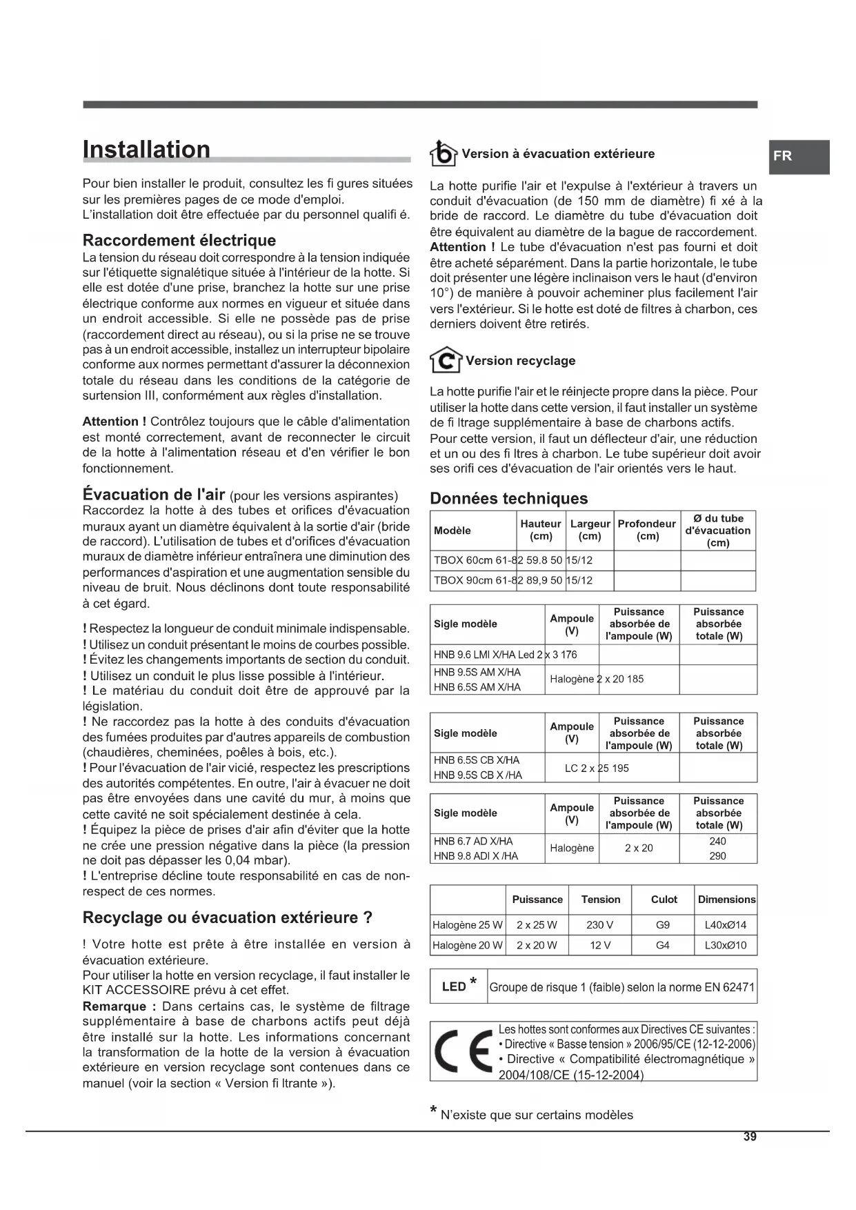 Puissance Tension Culot DimensionsHalogène 25 W 2 x 25 W 230 V G9 L40xØ14 Halogène 20 W 2 x 20 W 12 V G4 L30xØ10 LED *Groupe de risque 1 (faible) selon la norme EN 62471 Les hottes sont conformes aux Directives CE suivantes :