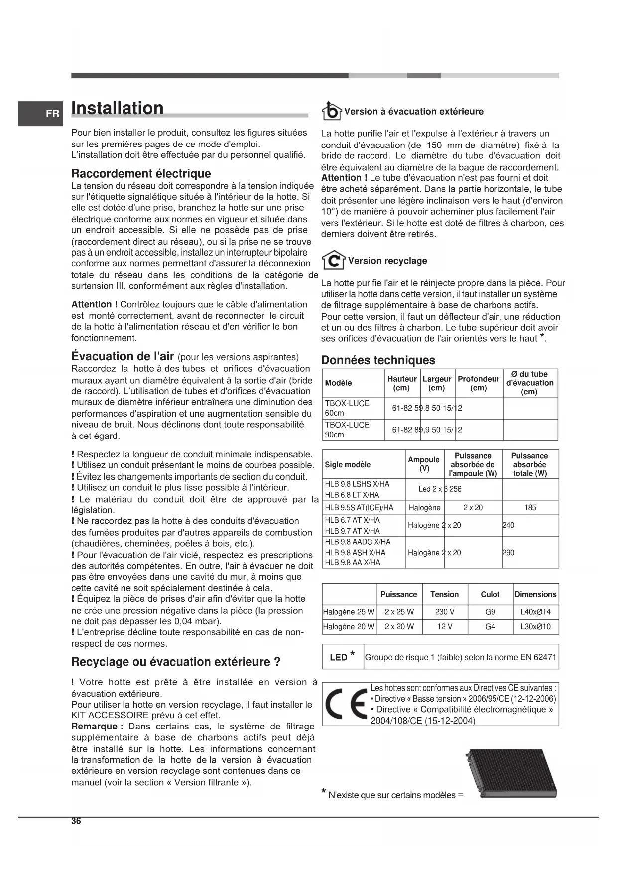 Installation Pour bien installer le produit, consultez les gures situées sur les premières pages de ce mode d'emploi. L’installation doit être effectuée par du personnel qualié. Raccordement électrique La tension du réseau doit correspondre à la tension indiquée sur l'étiquette signalétique située à l'intérieur de la hotte. Si elle est dotée d'une prise, branchez la hotte sur une prise électrique conforme aux normes en vigueur et située dans un endroit accessible. Si elle ne possède pas de prise (raccordement direct au réseau), ou si la prise ne se trouve pas à un endroit accessible, installez un interrupteur bipolaire conforme aux normes permettant d'assurer la déconnexion totale du réseau dans les conditions de la catégorie de surtension III, conformément aux règles d'installation. Attention ! Contrôlez toujours que le câble d'alimentation est monté correctement, avant de reconnecter le circuit de la hotte à l'alimentation réseau et d'en vérier le bon fonctionnement. Évacuation de l'air (pour les versions aspirantes) Raccordez la hotte à des tubes et orices d'évacuation muraux ayant un diamètre équivalent à la sortie d'air (bride de raccord). L’utilisation de tubes et d'orices d'évacuation muraux de diamètre inférieur entraînera une diminution des performances d'aspiration et une augmentation sensible du niveau de bruit. Nous déclinons dont toute responsabilité à cet égard. ! Respectez la longueur de conduit minimale indispensable. ! Utilisez un conduit présentant le moins de courbes possible. ! Évitez les changements importants de section du conduit. ! Utilisez un conduit le plus lisse possible à l'intérieur. ! Le matériau du conduit doit être de approuvé par la législation. ! Ne raccordez pas la hotte à des conduits d'évacuation des fumées produites par d'autres appareils de combustion (chaudières, cheminées, poêles à bois, etc.). ! Pour l'évacuation de l'air vicié, respectez les prescriptions des autorités compétentes. En outre, l'air à évacuer ne doit pas être envoyées dans une cavité du mur, à moins que cette cavité ne soit spécialement destinée à cela. ! Équipez la pièce de prises d'air an d'éviter que la hotte ne crée une pression négative dans la pièce (la pression ne doit pas dépasser les 0,04 mbar). ! L'entreprise décline toute responsabilité en cas de non- respect de ces normes. Recyclage ou évacuation extérieure ? ! Votre hotte est prête à être installée en version à évacuation extérieure. Pour utiliser la hotte en version recyclage, il faut installer le KIT ACCESSOIRE prévu à cet effet. Remarque : Dans certains cas, le système de ltrage supplémentaire à base de charbons actifs peut déjà être installé sur la hotte. Les informations concernant la transformation de la hotte de la version à évacuation extérieure en version recyclage sont contenues dans ce manuel (voir la section « Version ltrante »). Version à évacuation extérieure La hotte purie l'air et l'expulse à l'extérieur à travers un conduit d'évacuation (de 150 mm de diamètre) xé à la bride de raccord. Le diamètre du tube d'évacuation doit être équivalent au diamètre de la bague de raccordement. Attention ! Le tube d'évacuation n'est pas fourni et doit être acheté séparément. Dans la partie horizontale, le tube doit présenter une légère inclinaison vers le haut (d'environ 10°) de manière à pouvoir acheminer plus facilement l'air vers l'extérieur. Si le hotte est doté de ltres à charbon, ces derniers doivent être retirés. Version recyclage La hotte purie l'air et le réinjecte propre dans la pièce. Pour utiliser la hotte dans cette version, il faut installer un système de ltrage supplémentaire à base de charbons actifs. Pour cette version, il faut un déecteur d'air, une réduction et un ou des ltres à charbon. Le tube supérieur doit avoir ses orices d'évacuation de l'air orientés vers le haut *. Données techniques ModèleHauteur (cm) Largeur (cm) Profondeur (cm) Ø du tube d'évacuation (cm) TBOX-LUCE 60cm 61-82 59.8 50 15/12TBOX-LUCE 90cm 61-82 89,9 50 15/12Sigle modèleAmpoule (V) Puissance absorbée de l'ampoule (W)Puissance absorbée totale (W)HLB 9.8 LSHS X/HAHLB 6.8 LT X/HALed 2 x 3 256 HLB 9.5S AT(ICE)/HA Halogène 2 x 20 185 HLB 6.7 AT X/HAHLB 9.7 AT X/HAHalogène 2 x 20 240HLB 9.8 AADC X/HAHLB 9.8 ASH X/HAHLB 9.8 AA X/HAHalogène 2 x 20 290Puissance Tension Culot DimensionsHalogène 25 W 2 x 25 W 230 V G9 L40xØ14 Halogène 20 W 2 x 20 W 12 V G4 L30xØ10 LED *Groupe de risque 1 (faible) selon la norme EN 62471 Les hottes sont conformes aux Directives CE suivantes :