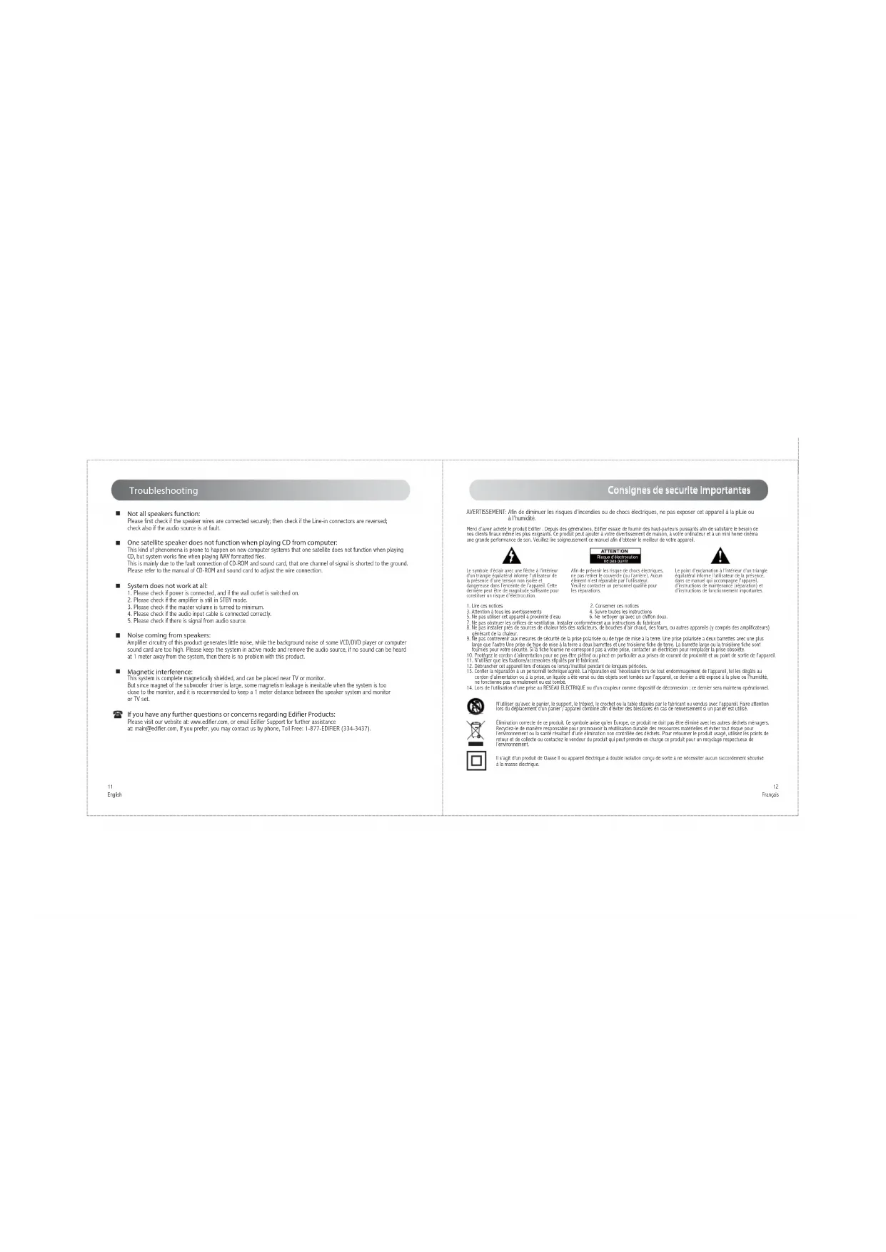 Il y a du bruit dans les haut-parleurs: L’équipement de l’amplificateur de ce produit génère peu de bruit alors que le bruit de fond de certains lecteurs VCD/DVD ou la carte son de l’ordinateur sont trop élévés. Veuillez laisser le système en mode actif et retirer la source audio. Si aucun son n’est entendu à 1 mètre du système, alors il n’y a aucun problème avec le produit. Interférence magnétique: Ce système est entièrement protégé magnétiquement et peut être placé près d’une TV ou d’un moniteur. Mais puisque l’aimant du caisson de basses est trop gros, une fuite de magnétisme est inévitable lorsque l’appareil est trop près du moniteur et il est recommandé de garder 1 mètre de distance entre le système haut-parleur et le moniteur ou le poste de TV. Si vous avez d’autres questions ou préoccupations concernant les Produits Edifier Veuillez consulter notre site Internet : www.edifier.com, ou envoyez un courriel à Edifier Support pour davantage d’aide: main@edifier.com, Si vous préférez, vous pouvez nous contacter par téléphone, Numéro Gratuit: 1-877-EDIFIER (334-3437).23 Español