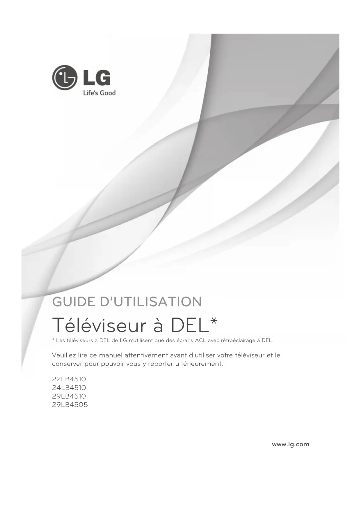 - Les téléviseurs à DEL de LG n’utilisent que des écrans ACL avec rétroéclairage à DEL. Veuillez lire ce manuel attentivement avant d’utiliser votre téléviseur et le conserver pour pouvoir vous y reporter ultérieurement. www.lg.com 22LB4510 24LB4510 29LB4510 29LB45052 FRANÇAIS