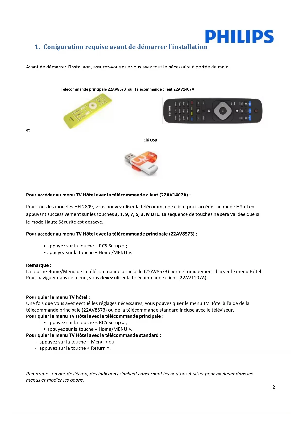 - Le périphérique USB doit être formaté en FAT ou FAT32. Accédez au menu du mode Hôtel avec la RC 8573 (télécommande jaune) ou avec la télécommande client en appuyant successivement sur les touches 3, 1, 9, 7, 5, 3, MUTE, puis naviguez à travers les options suivantes avec la télécommande : [Copier depuis USB]