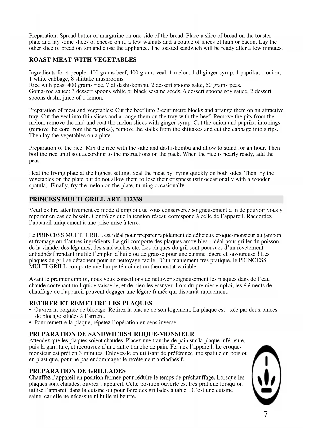 Chauffez l’appareil en position fermée pour réduire le temps de préchauffage. Lorsque les plaques sont chaudes, ouvrez l’appareil. Cette position ouverte est très pratique lorsqu’on utilise l’appareil dans la cuisine ou pour faire des grillades à table ! C’est une cuisine saine, car elle ne nécessite ni huile ni beurre.8 Choisissez une température et un temps de cuisson adéquats, en fonction des aliments et des ingrédients utilisés. Faites quelques essais en modifiant la température et le temps de cuisson, pour obtenir les meilleurs résultats. Les petits morceaux de viande, poisson, etc. se cuisent mieux et plus rapidement que les gros morceaux. Ne retournez la viande et le poisson qu’une seule fois, sinon le morceau sèche. Ne piquez pas non plus la viande avec une fourchette, mais utilisez plutôt une spatule. Sur la plaque, utilisez éventuellement une spatule en bois ou en plastique, mais pas de couvert métallique pour ne pas endommager le revêtement antiadhésif. Vous pouvez aussi griller des aliments lorsque l’appareil est fermé. Vous déposez les morceaux de viande, poisson ou autres ingrédients sur la plaque inférieure, avant de refermer l’appareil. NETTOYAGE RETIREZ AU PREALABLE LA FICHE DE LA PRISE. Nettoyez l’appareil après chaque emploi. Laissez au préalable refroidir complètement l’appareil. Essuyez la partie extérieure avec un chiffon humide. Les plaques sont nettoyées dans de l’eau contenant un liquide vaisselle, et rincées sous l’eau du robinet. Ne grattez pas le revêtement antiadhésif avec des objets métalliques tranchants ni avec des produits de nettoyage agressifs. Si les plaques sont très sales, laissez-les tremper une demi-heure environ dans de l’eau chaude savonneuse. Après avoir fait des grillades, il suffit souvent d’essuyer les plaques avec du papier nettoie-tout lorsqu’elles sont encore un peu chaudes. LA GARANTIE NE COUVRE PAS LES DOMMAGES CAUSES AUX PLAQUES PAR DES OBJETS TRANCHANTS ! CONSEILS PRINCESS - Placez l’appareil sur un support stable et solide, résistant à la chaleur. - Si vous utilisez l’appareil en position ouverte, le plateau de table ou le plan de travail devient très chaud. Ne placez donc jamais l’appareil ouvert, sans protection, sur un plateau en plastique. - Ne plongez jamais l’appareil dans l’eau ni dans tout autre liquide. - La partie extérieure de l’appareil devient très chaude. Saisissez l’appareil uniquement par la poignée. - Ne placez pas l’appareil au bord d’une table, plan de travail, etc., pour éviter qu’on ne le renverse par mégarde ; veillez également à ce que personne ne puisse trébucher sur le cordon. - N’utilisez pas l’appareil s’il est défectueux ou si le cordon est endommagé, mais envoyez-le à notre service après-vente. La réparation du cordon de ce type d’appareils exige des outils spéciaux et ne peut être effectuée que par notre service après-vente. - Ne placez pas l’appareil sur ou à proximité d’une plaque de cuisson chaude, etc. - Retirez toujours la fiche de la prise avant de nettoyer l’appareil ou s’il est défectueux. - Les plaques deviennent très chaudes. Veillez à ce qu’elles soient hors de portée des enfants et soyez vous-même très prudent. - N’utilisez pas de produits de nettoyage abrasifs. - Utilisez l’appareil uniquement comme indiqué dans le mode d’emploi. - N’utilisez pas d’accessoires non recommandés par le fabricant. - Le cordon ne doit pas toucher les plaques. - Veiller à ce que les enfants ne jouent pas avec l’appareil. - L’utilisation de cet appareil par des enfants ou des handicapés physiques, sensoriels, mentaux ou moteurs, ou dénués d’expérience et de connaissance peut être dangereuse. Les personnes responsables de leur sécurité devront fournir des instructions explicites ou surveiller l’utilisation de l’appareil.9 QUELQUES RECETTES CROQUE-MONSIEUR AUX NOIX : Ingrédients (4 personnes) 8 tranches de pain au choix un peu de beurre ou de margarine 200 g de fromage (par exemple brie ou chèvre !) 60 g de noix décortiquées 8 tranches de jambon ou de bacon Préparation : Beurrer le pain sur un côté avec du beurre ou de la margarine. Placer une tranche de pain sur la plaque à croque-monsieur et recouvrir de quelques tranches de fromage, noix, jambon ou bacon. Recouvrir avec une autre tranche de pain et fermer l’appareil. Le croque-monsieur est prêt en quelques minutes.